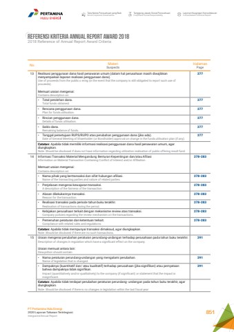 Referensi Kriteria Annual Report Award 20182018 Reference of Annual Report Award CriteriaNo MateriSuspectsHalamanPage13 Realisasi penggunaan dana hasil penawaran umum (dalam hal perusahaan masih diwajibkan menyampaikan laporan realisasi penggunaan dana).Use of proceeds from the public o ering (in the event that the company is still obligated to report such use of proceeds).Memuat uraian mengenai:Contains description on:277%u2022 Total perolehan dana.Total funds obtained.277%u2022 Rencana penggunaan dana.Plan for funds utilisation.277%u2022 Rincian penggunaan dana.Details of funds utilisation.277%u2022 Saldo dana.Remaining balance of funds.277%u2022 Tanggal persetujuan RUPS/RUPO atas perubahan penggunaan dana (jika ada).Date of General Meeting of Shareholder (or Bondholder) approval on change in the funds utilisation plan (if any).277Catatan: Apabila tidak memiliki informasi realisasi penggunaan dana hasil penawaran umum, agar diungkapkan.Note: Should be disclosed if does not have information regarding utilization realisation of public offering result fund.14 Informasi Transaksi Material Mengandung Benturan Kepentingan dan/atau AfilasiInformation on Material Transaction Containing Conflict of Interest and/or Affiliation.Memuat uraian mengenai:Contains description on:278-283%u2022 Nama pihak yang bertransaksi dan sifat hubungan afiliasi.Name of the transacting parties and nature of related parties.278-283%u2022 Penjelasan mengenai kewajaran transaksi.A description of the fairness of the transaction.278-283%u2022 Alasan dilakukannya transaksi.Reason for the transaction.278-283%u2022 Realisasi transaksi pada periode tahun buku terakhir.Realisation of transactions during the period.278-283%u2022 Kebijakan perusahaan terkait dengan mekanisme review atas transaksi.Company policies regarding the review mechanism on the transactions.278-283%u2022 Pemenuhan peraturan dan ketentuan terkait.Compliance with related rules and regulations.278-283Catatan: Apabila tidak mempunyai transaksi dimaksud, agar diungkapkan.Note: Should be disclosed if there are no such transactions.15 Uraian mengenai perubahan peraturan perundang-undangan terhadap perusahaan pada tahun buku terakhir.Description of changes in regulation which have a significant effect on the company.Uraian memuat antara lain:Descprition should contain:291%u2022 Nama peraturan perundang-undangan yang mengalami perubahan.Name of legislation that is changed.291%u2022 Dampaknya (kuantitatif dan/ atau kualitatif) terhadap perusahaan (jika signifikan) atau pernyataan bahwa dampaknya tidak signifikan.Impact (quantitatively and/or qualitatively) to the company (if significant) or statement that the impact is insignificant.291Catatan: Apabila tidak terdapat perubahan peraturan perundang- undangan pada tahun buku terakhir, agar diungkapkan.Note: Should be disclosed if there is no changes in legislation within the last fiscal yearTata Kelola Perusahaan yang BaikGood Corporate GovernanceTanggung Jawab Sosial PerusahaanCorporate Social ResponsibilityLaporan Keuangan KonsolidasianConsolidated Financial ReportPT Pertamina Hulu Energi2020 Laporan Tahunan TerintegrasiIntegrated Annual Report 851
