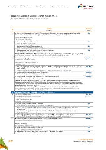 No MateriSuspectsHalamanPage16 Uraian mengenai perubahan kebijakan akuntansi yang diterapkan perusahaan pada tahun buku terakhir.Description of changes in the accounting policy implemented by the company in the last fiscal year.Uraian memuat antara lain:Descprition should contain:291%u2022 Perubahan kebijakan akuntansi.Changes of accounting policies.291%u2022 Alasan perubahan kebijakan akuntansi.Reasons for the change of accounting policy.291%u2022 Dampaknya secara kuantitatif terhadap laporan keuangan.Quantitative impact to the financial report.291Catatan: Apabila tidak terdapat perubahan kebijakan akuntansi pada tahun buku terakhir, agar diungkapkan.Note: Should be disclosed if there is no changes in accounting policy within the last fiscal year.17 Informasi kelangsungan usaha.Information of Business continuity.Pengungkapan informasi mengenai:Disclosure about:284-286%u2022 Hal-hal yang berpotensi berpengaruh signi kan terhadap kelangsungan usaha perusahaan pada tahun buku terakhir.Issues with significant potential to affect company%u2019s business continuity in the last fiscal year.284-286%u2022 Assessment manajemen atas hal hal pada angka 1.Management assessment on issues in number 1.284-286%u2022 Asumsi yang digunakan manajemen dalam melakukan assessment.Assumptions used by management in doing assessment.284-286Catatan: Apabila tidak terdapat hal-hal yang berpotensi berpengaruh signifikan terhadap kelangsungan usaha perusahaan pada tahun buku terakhir, agar diungkapkan asumsi yang mendasari manajemen dalam meyakini bahwa tidak terdapat hal-hal yang berpotensi berpengaruh signi kan terhadap kelangsungan usaha perusahaan pada tahun buku terakhir.Note: If there are no issues of significant potential to a ect business continuity in the last fiscal year, should be disclosed underlying assumption which is used by management to assure that there are no issues of signi cant potential to a ect business continuity in the last scal year.VI Tata Kelola Perusahaan yang Baik | Good Corporate Governance1 Uraian Dewan Komisaris.Information on the Board of Commissioners.Uraian memuat antara lain:Descprition should contain:324-340%u2022 Uraian tanggung jawab Dewan Komisaris.Description of the responsibility of the Board of Commissioners.327%u2022 Penilaian atas kinerja masing- masing komite yang berada di bawah Dewan Komisaris dan dasar penilaiannya.Assessment of the performance of each committee under the Board of Commissioners and the basisof its assessment.336%u2022 Pengungkapan mengenai Board Charter (pedoman dan tata tertib kerja Dewan Komisaris).Disclosing the Board Charter (guidance and work procedure of the Board of Commissioners).334-3352 Komisaris Independen (jumlahnya minimal 20% dari total Dewan Komisaris).Information about Independent Commissioner.Meliputi antara lain:The information should contain:336-338%u2022 Kriteria penentuan Komisaris Independen.The criteria of Independent Commissioner.337%u2022 Pernyataan tentang independensi masing-masing Komisaris Independen.Statement about the independency of each Independent Commissioner.338Referensi Kriteria Annual Report Award 20182018 Reference of Annual Report Award CriteriaIkhtisar 20202020 HighlightsLaporan ManajemenManagement ReportProfil PerusahaanCompany ProfileAnalisa & Diskusi ManajemenManagement Discussion & AnalysisPT Pertamina Hulu Energi2020 Laporan Tahunan TerintegrasiIntegrated Annual Report 852