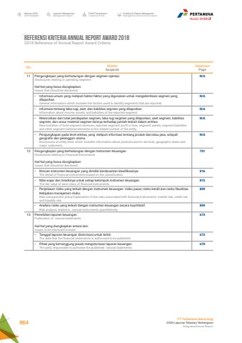 No MateriSuspectsHalamanPage11 Pengungkapan yang berhubungan dengan segmen operasi.Disclosures relating to operating segment.Hal-hal yang harus diungkapkan:Issues that should be disclosed:N/A%u2022 Informasi umum yang meliputi faktor-faktor yang digunakan untuk mengidentikasi segmen yang dilaporkan.General information which includes the factors used to identify segments that are reported.N/A%u2022 Informasi tentang laba rugi, aset, dan liabilitas segmen yang dilaporkan.Information about income, assets, and liabilities of the reported segment.N/A%u2022 Rekonsiliasi dari total pendapatan segmen, laba rugi segmen yang dilaporkan, aset segmen, liabilitas segmen, dan unsur material segmen lainnya terhadap jumlah terkait dalam entitas.Reconciliation of total segment revenues, reported segment profit or loss, segment assets, segment liabilities and other segment material elements to the related number of the entity.N/A%u2022 Pengungkapan pada level entitas, yang meliputi informasi tentang produk dan/atau jasa, wilayah geografis dan pelanggan utama.Disclosures at entity level, which includes information about products and/or services, geographic areas and major customers.N/A12 Pengungkapan yang berhubungan dengan Instrumen Keuangan.Disclosures relating to Financial Instruments.Hal-hal yang harus diungkapkan:Issues that should be disclosed:701%u2022 Rincian instrumen keuangan yang dimiliki berdasarkan klasifikasinya.The Detail of financial instruments based on the classification.816%u2022 Nilai wajar dan hirarkinya untuk setiap kelompok instrumen keuangan.The fair value of each class of financial instruments.815%u2022 Penjelasan risiko yang terkait dengan instrumen keuangan: risiko pasar, risiko kredit dan risiko likuiditas Kebijakan manajemen risiko.Risk management policy Explanation of the risks associated with financial instruments: market risk, credit risk and liquidity risk.809%u2022 Analisis risiko yang terkait dengan instrumen keuangan secara kuantitatif.Risk analysis related to nancial instruments quantitatively.80913 Penerbitan laporan keuangan.Publication of nancial statements.Hal-hal yang diungkapkan antara lain:Issues to be disclosed include:673%u2022 Tanggal laporan keuangan diotorisasi untuk terbit.The date that the financial statements is authorised to be published673%u2022 Pihak yang bertanggung jawab mengotorisasi laporan keuangan.The party responsible to authorise the published nancial statements.670Referensi Kriteria Annual Report Award 20182018 Reference of Annual Report Award CriteriaIkhtisar 20202020 HighlightsLaporan ManajemenManagement ReportProfil PerusahaanCompany ProfileAnalisa & Diskusi ManajemenManagement Discussion & AnalysisPT Pertamina Hulu Energi2020 Laporan Tahunan TerintegrasiIntegrated Annual Report 864