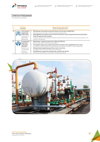 STRATEGI PERUSAHAANCompany StrategiesNo StrategiStrategiesUpaya Pencapaian 20202020 Achievement Effort10 Partnership & Stakeholder RelationshipPartnership & Stakeholder Relationship%u2022 Membangun komunikasi yang baik dengan Partnership & Stakeholder.Build good communication with Partnership & Stakeholders.%u2022 Meningkatkan komunikasi internal PHE & Pertamina untuk menjadi aktif partnership dalam Anak Perusahaan Non operator.Improve internal communication between PHE & Pertamina to become an active partnership in nonoperator Subsidiaries.11 Pembentukan organisasi Subholding UpstreamEstablishment of Subholding Upstream Organization%u2022 Membangun organisasi yang Lean, Agile and efficient.Build a Lean, Agile and efficient organization.%u2022 Peningkatan daya saing melalui operational excellence dan kapabilitas best in class.Increasing competitiveness through operational excellence and best in class capabilities.%u2022 Mempercepat pengembangan bisnis saat ini dan baru.Accelerate current and new business development.%u2022 Pembaharuan organisasi, budaya kerja, mindset dan talenta.Renewal of organization, work culture, mindset and talents.Tata Kelola Perusahaan yang BaikGood Corporate GovernanceTanggung Jawab Sosial PerusahaanCorporate Social ResponsibilityLaporan Keuangan KonsolidasianConsolidated Financial ReportPT Pertamina Hulu Energi2020 Laporan Tahunan TerintegrasiIntegrated Annual Report 87