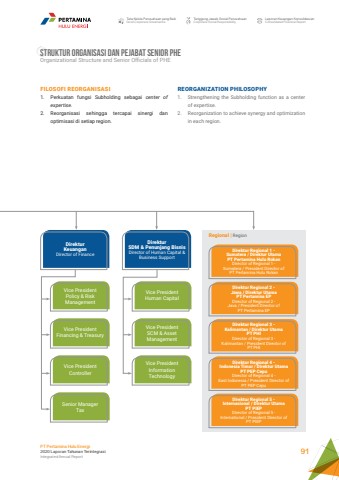 STRUKTUR ORGANISASI DAN PEJABAT SENIOR PHE Organizational Structure and Senior Officials of PHEFILOSOFI REORGANISASI 1. Perkuatan fungsi Subholding sebagai center of expertise.2. Reorganisasi sehingga tercapai sinergi dan optimisasi di setiap region.REORGANIZATION PHILOSOPHY1. Strengthening the Subholding function as a center of expertise.2. Reorganization to achieve synergy and optimization in each region.Tata Kelola Perusahaan yang BaikGood Corporate GovernanceTanggung Jawab Sosial PerusahaanCorporate Social ResponsibilityLaporan Keuangan KonsolidasianConsolidated Financial ReportPT Pertamina Hulu Energi2020 Laporan Tahunan TerintegrasiIntegrated Annual Report 91Direktur SDM & Penunjang BisnisDirector of Human Capital & Business SupportDirektur KeuanganDirector of FinanceVice PresidentHuman CapitalVice PresidentPolicy & Risk ManagementVice PresidentSCM & Asset ManagementVice PresidentFinancing & TreasuryVice PresidentInformation TechnologyVice PresidentControllerSenior ManagerTaxRegional | RegionDirektur Regional 1 - Sumatera / Direktur Utama PT Pertamina Hulu RokanDirector of Regional 1 - Sumatera / President Director of PT Pertamina Hulu RokanDirektur Regional 2 - Jawa / Direktur Utama PT Pertamina EPDirector of Regional 2 - Java / President Director of PT Pertamina EPDirektur Regional 4 - Indonesia Timur / Direktur Utama PT PEP CepuDirector of Regional 4 - East Indonesia / President Director of PT PEP CepuDirektur Regional 3 - Kalimantan / Direktur Utama PT PHIDirector of Regional 3 - Kalimantan / President Director of PT PHIDirektur Regional 5 - Internasional / Direktur Utama PT PIEPDirector of Regional 5 - International / President Director of PT PIEP