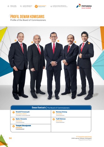 03 Tumpak SimanjuntakKomisarisCommissionerPROFIL DEWAN KOMISARISProfile of the Board of Commissioners01 0402 0503Rinaldi FirmansyahKomisaris UtamaPresident CommissionerNanang UntungKomisaris CommissionerDjoko SiswantoKomisarisCommissionerFadli RahmanKomisarisCommissionerTumpak SimanjuntakKomisarisCommissionerDewan Komisaris | The Board of Commissioners010305 0204Laporan ManajemenManagement ReportProfil PerusahaanCompany ProfileAnalisa & Diskusi ManajemenManagement Discussion & AnalysisIkhtisar 20202020 HighlightsPT Pertamina Hulu Energi2020 Laporan Tahunan TerintegrasiIntegrated Annual Report 94