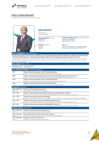 Djoko SiswantoKomisarisCommissionerKewarganegaraan | CitizenUsia | AgeTempat & Tanggal Lahir | Place & Date of BirthDomisili | DomicileIndonesiaIndonesiaBerusia, 55 tahun per 31 Desember 2020 55 years old as of December 31, 2020Jakarta, 23 Mei 1965Jakarta, May 23, 1965JakartaJakartaProfil Dewan KomisarisProfile of the Board of CommissionersDasar Pengangkatan | Appointment BasisDiangkat sebagai Komisaris Perseroan sejak 06 Agustus 2018 berdasarkan Keputusan RUPS Secara Sirkuler Tanggal 06 Agustus 2018 tentang Pemberhentian, Perubahan Nomenklatur Jabatan serta Pengangkatan Direksi dan Dewan Komisaris.Appointed as a Commissioner of the Company since August 06, 2018 based on Decision of General Meeting of Shareholders Circularly dated August 06, 2018 about Dismissal, Changes in the Nomenclature of Position and Appointment of the Board of Directors and the Board of Commissioners.Masa Jabatan | Term of Office06 Agustus 2018 %u2013 05 Agustus 2021August 06, 2018 - August 05, 2021Latar Belakang Pendidikan | Educational Background2011 Doktor Teknik Perminyakan Institut Teknologi Bandung Doctor of Petroleum Engineering, Bandung Institute of Technology2002 Master of Business Administration Specialist Oil & Gas Management Dundee University UK Master of Business Administration Specialist Oil & Gas Management Dundee University UK1990 Sarjana Teknik Perminyakan Institut Teknologi BandungBachelor Degree of Petroleum Engineering, Bandung Institute of Technology1985 Diploma Teknik Mesin Politeknik Universitas IndonesiaDiploma of Mechanical Engineering, University of Indonesia PolytechnicPengalaman | Experience2020 - Sekarang PresentKomisaris PT Pertamina Hulu Energi Commissioner of PT Pertamina Hulu Energi2018 - 2019 Direktur Jenderal Minyak dan Gas Bumi Kementerian ESDM Republik IndonesiaDirector General of Oil and Gas, Ministry of Energy and Mineral Resources Republic of Indonesia2017 - 2018 Deputi Pengendalian Pengadaan SKK MigasDeputy of Procurement Control at Special Task Force for Upstream Oil and Gas Business Activities (SKK Migas)2016 - 2017 Direktur Teknik Migas Kementerian ESDM Republik IndonesiaDirector of Oil and Gas Technic, Ministry of Energy and Mineral Resources Republic of Indonesia2015 - 2016 Direktur Hulu Migas Kementerian ESDM Republik Indonesia Director of Upstream Oil and Gas, Ministry of Energy and Mineral Resources Republic of IndonesiaRangkap Jabatan | Dual Position2019 - Sekarang PresentSekretaris Jenderal Dewan Energi Nasional Secretary General of the National Energy Council2020 - Sekarang PresentKetua Komite Nominasi dan Remunerasi PerseroanHead of Nomination and Remuneration Committee of the Company2020 - Sekarang PresentAnggota Komite Audit PerseroanMember of Audit Committee of the CompanyTata Kelola Perusahaan yang BaikGood Corporate GovernanceTanggung Jawab Sosial PerusahaanCorporate Social ResponsibilityLaporan Keuangan KonsolidasianConsolidated Financial ReportPT Pertamina Hulu Energi2020 Laporan Tahunan TerintegrasiIntegrated Annual Report 97