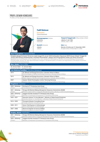 Fadli RahmanKomisarisCommissionerKewarganegaraan | CitizenUsia | AgeTempat & Tanggal Lahir | Place & Date of BirthDomisili | DomicileIndonesiaIndonesiaBerusia, 34 tahun per 31 Desember 202034 years old as of December 31, 2020Jakarta, 5 Juli 1986Jakarta, July 5, 1986JakartaJakartaProfil Dewan KomisarisProfile of the Board of CommissionersDasar Pengangkatan | Appointment BasisDiangkat sebagai Komisaris Perseroan sejak tanggal 28 Januari 2020 berdasarkan Keputusan RUPS Secara Sirkuler Tanggal 28 Januari 2020 tentang Pemberhentian, Perubahan Nomenklatur Jabatan serta Pengangkatan Direksi dan Dewan Komisaris.Appointed as a Commissioner of the Company since June January 28, 2020 based on Decision of General Meeting of Shareholders Circularly dated January 28, 2020 about Dismissal, Changes in the Nomenclature of Position and Appointment of the Board of Directors and the Board of Commissioners.Masa Jabatan | Term of Office28 Januari 2020 %u2013 27 Januari 2023 January 28, 2020 %u2013 January 27, 2023Latar Belakang Pendidikan | Educational Background2016 S3, Mineral and Energy Economics, Colorado School of MinesDoctoral Degree of Mineral and Energy Economics, Colorado School of Mines2013 S2, Mineral and Energy Economics, Colorado School of MinesMaster Degree of Mineral and Energy Economics, Colorado School of Mines2007 Sarjana Teknik Perminyakan Institut Teknologi BandungBachelor Degree of Petroleum Engineering, Bandung Institute of TechnologyPengalaman | Experience2020 - Sekarang PresentKomisaris PT Pertamina Hulu Energi Commissioner of PT Pertamina Hulu Energi2021 - Sekarang PresentTenaga Ahli Menteri Bidang Manajemen Korporasi, Kementerian BUMNMinister's Expert Staff of Corporate Management Sector, Ministry of State-Owned Enterprise2020 - Sekarang PresentAnggota Komite Investasi PT Pertamina Hulu EnergiMember of Investment Committee at PT Pertamina Hulu Energi2020 - 2021 Executive Advisor To Vice Minister-1, Ministry of State-Owned EnterpriseExecutive Advisor To Vice Minister-1, Ministry of State-Owned Enterprise2016 - 2020 Principal di Boston Consulting GroupPrincipal at Boston Consulting Group2008 - 2011 Senior Field Engineer di SchlumbergerSenior Field Engineer at Schlumberger2007 - 2008 Reservoir Engineer di Conoco PhillipsReservoir Engineer at Conoco PhillipsRangkap Jabatan | Dual Position2021 - Sekarang PresentTenaga Ahli Menteri Bidang Manajemen Korporasi, Kementerian BUMNMinister's Expert Staff of Corporate Management Sector, Ministry of State-Owned Enterprise2020 - Sekarang PresentAnggota Komite Investasi PT Pertamina Hulu EnergiMember of Investment Committee at PT Pertamina Hulu EnergiLaporan ManajemenManagement ReportProfil PerusahaanCompany ProfileAnalisa & Diskusi ManajemenManagement Discussion & AnalysisIkhtisar 20202020 HighlightsPT Pertamina Hulu Energi2020 Laporan Tahunan TerintegrasiIntegrated Annual Report 98