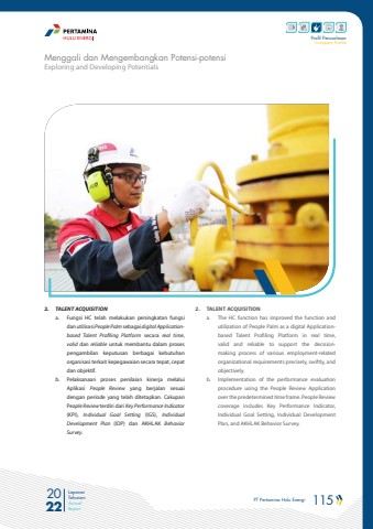 PT Pertamina Hulu Energi 115 2022Laporan TahunanAnnual ReportProfil PerusahaanCompany Profile2. TALENT ACQUISITIONa. Fungsi HC telah melakukan peningkatan fungsidan utilisasi People Palm sebagai digital Applicationbased Talent Profiling Platform secara real time, valid dan reliable untuk membantu dalam prosespengambilan keputusan berbagai kebutuhanorganisasi terkait kepegawaian secara tepat, cepat dan objektif.b. Pelaksanaan proses penilaian kinerja melaluiAplikasi People Review yang berjalan sesuaidengan periode yang telah ditetapkan. CakupanPeople Review terdiri dari Key Performance Indicator (KPI), Individual Goal Setting (IGS), Individual Development Plan (IDP) dan AKHLAK Behavior Survey.2. TALENT ACQUISITIONa. The HC function has improved the function andutilization of People Palm as a digital Applicationbased Talent Profiling Platform in real time,valid and reliable to support the decisionmaking process of various employment-relatedorganizational requirements precisely, swiftly, andobjectively.b. Implementation of the performance evaluationprocedure using the People Review Applicationover the predetermined time frame. People Review coverage includes Key Performance Indicator,Individual Goal Setting, Individual DevelopmentPlan, and AKHLAK Behavior Survey.Exploring and Developing PotentialsMenggali dan Mengembangkan Potensi-potensi
