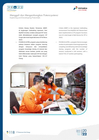 118 PT Pertamina Hulu Energi 2022Laporan TahunanAnnual ReportProfil PerusahaanCompany ProfileKriteria Kinerja Ekselen Pertamina (KKEP) di lingkungan Subholding Upstream. Dari MyIDEA tersebut, terdata sebanyak 947 tema telah ditindaklanjuti menjadi program CIP Fungsi (dari total target 666 tema CIP di Tahun 2022).%u00bb PUSHKU & ULTRA, program yang mendorongpekerja berperan dalam program learning dengan menyusun dan menyediakanprogram knowledge sharing di internal dandilakukan secara berkala, jumlah sesi yangtelah dilaksanakan sebanyak 244 Sesi dengan total Pekerja yang berpartisipasi 195.127Orang.Criteria (KKEP) in the Upstream Subholding environment. From MyIDEA, 947 themes have been implemented as CIP program functions (out of a total target of 666 themes for CIP in 2022).%u00bb PUSHKU & ULTRA , a program that encourages workers to participate in learning programs by compiling and delivering internal knowledgesharing programs with the number ofsessions conducted is 244 sessions, with atotal of 195,127 workers participating. Exploring and Developing PotentialsMenggali dan Mengembangkan Potensi-potensi