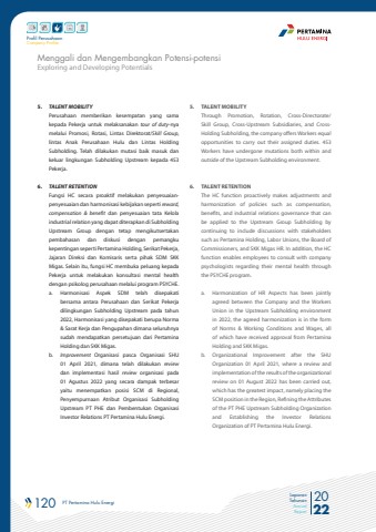120 PT Pertamina Hulu Energi 2022Laporan TahunanAnnual ReportProfil PerusahaanCompany Profile5. TALENT MOBILITYPerusahaan memberikan kesempatan yang samakepada Pekerja untuk melaksanakan tour of duty-nya melalui Promosi, Rotasi, Lintas Direktorat/Skill Group, lintas Anak Perusahaan Hulu dan Lintas HoldingSubholding. Telah dilakukan mutasi baik masuk dankeluar lingkungan Subholding Upstream kepada 453Pekerja.6. TALENT RETENTIONFungsi HC secara proaktif melakukan penyesuaianpenyesuaian dan harmonisasi kebijakan seperti reward, compensation & benefit dan penyesuaian tata Kelolaindustrial relation yang dapat diterapkan di Subholding Upstream Group dengan tetap mengikutsertakanpembahasan dan diskusi dengan pemangkukepentingan seperti Pertamina Holding, Serikat Pekerja, Jajaran Direksi dan Komisaris serta pihak SDM SKKMigas. Selain itu, fungsi HC membuka peluang kepadaPekerja untuk melakukan konsultasi mental healthdengan psikolog perusahaan melalui program PSYCHE.a. Harmonisasi Aspek SDM telah disepakatibersama antara Perusahaan dan Serikat Pekerjadilingkungan Subholding Upstream pada tahun2022, Harmonisasi yang disepakati berupa Norma& Sarat Kerja dan Pengupahan dimana seluruhnyasudah mendapatkan persetujuan dari PertaminaHolding dan SKK Migas.b. Improvement Organisasi pasca Organisasi SHU01 April 2021, dimana telah dilakukan review dan implementasi hasil review organisasi pada01 Agustus 2022 yang secara dampak terbesaryaitu menempatkan posisi SCM di Regional,Penyempurnaan Atribut Organisasi SubholdingUpstream PT PHE dan Pembentukan OrganisasiInvestor Relations PT Pertamina Hulu Energi.5. TALENT MOBILITYThrough Promotion, Rotation, Cross-Directorate/Skill Group, Cross-Upstream Subsidiaries, and CrossHolding Subholding, the company offers Workers equal opportunities to carry out their assigned duties. 453Workers have undergone mutations both within andoutside of the Upstream Subholding environment.6. TALENT RETENTIONThe HC function proactively makes adjustments andharmonization of policies such as compensation,benefits, and industrial relations governance that canbe applied to the Upstream Group Subholding bycontinuing to include discussions with stakeholderssuch as Pertamina Holding, Labor Unions, the Board ofCommissioners, and SKK Migas HR. In addition, the HCfunction enables employees to consult with companypsychologists regarding their mental health throughthe PSYCHE program.a. Harmonization of HR Aspects has been jointlyagreed between the Company and the WorkersUnion in the Upstream Subholding environmentin 2022, the agreed harmonization is in the formof Norms & Working Conditions and Wages, allof which have received approval from PertaminaHolding and SKK Migas.b. Organizational Improvement after the SHUOrganization 01 April 2021, where a review andimplementation of the results of the organizational review on 01 August 2022 has been carried out,which has the greatest impact, namely placing the SCM position in the Region, Refining the Attributes of the PT PHE Upstream Subholding Organizationand Establishing the Investor RelationsOrganization of PT Pertamina Hulu Energi.Exploring and Developing PotentialsMenggali dan Mengembangkan Potensi-potensi