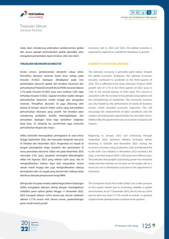 PT Pertamina Hulu Energi 125 2022Laporan TahunanAnnual ReportAnalisis dan Pembahasan ManajemenManagement Discussion and AnalysisGeneral ReviewTinjauan Umummaka akan mendorong pelemahan perekonomian global dan secara agregat pertumbuhan global diprediksi akan mengalami perlambatan tajam di tahun 2022 dan 2023.TINJAUAN EKONOMI DOMESTIK Secara umum, perekonomian domestik cukup sehat. Pemulihan ekonomi nasional masih terus melaju pada triwulan III-2022 meskipun dihadapkan pada tren perlambatan ekonomi global. Hal tersebut tercermin dari pertumbuhan Produk Domestik Bruto (PDB) nasional sebesar 5,7% pada triwulan III-2022 (yoy) atau tumbuh 1,8% (qtq) terhadap triwulan II-2022. Capaian tersebut sejalan dengan pertumbuhan konsumsi rumah tangga dan penguatan investasi. Pemulihan ekonomi ini juga didorong oleh kinerja di hampir seluruh sektor usaha yang mencatatkan pertumbuhan ekonomi yang positif. Hal tersebut akan mendorong perbaikan kondisi ketenagakerjaan dan penciptaan lapangan kerja bagi tambahan angkatan kerja baru. Di samping itu, pemerintah juga mencatat pertumbuhan ekspor dan impor. Inflasi domestik menunjukkan peningkatan di awal tahun hingga September 2022, dan kemudian bergerak menurun di Oktober dan November 2022. Pergerakan ini terjadi di tengah peningkatan biaya produksi dan permintaan di masa pemulihan ekonomi. Inflasi inti pada November 2022 mencapai 3,3% (yoy), bergerak meningkat dibandingkan inflasi inti Agustus 2022 yang sebesar 3,0% (yoy). Hal ini mengindikasikan bahwa daya beli masyarakat secara umum masih terjaga dan juga mengindikasikan adanya peningkatan dari sisi supply yang berasal dari naiknya biaya distribusi dampak penyesuaian harga BBM. Ditinjau dari sisi pasar modal, Indeks Harga Saham Gabungan (IHSG) mengalami tekanan seiring dengan meningkatnya volatilitas pasar saham global. Hingga 11 Desember 2022, IHSG menguat sebesar 2,03% secara ytd, namun melemah sebesar 5,17% secara mtd. Secara umum, perkembangan pasar modal masih positif. economy, and in 2022 and 2023, the global economy is expected to experience a significant slowdown in growth.DOMESTIC ECONOMIC REVIEWThe domestic economy is generally quite robust. Despite the global economic slowdown, the national economic recovery continued to accelerate in the third quarter of 2022. This is reflected in the Gross Domestic Product (GDP) growth rate of 5.7% in the third quarter of 2022 (yoy) or 1.8% in the second quarter of 2022 (qtq). This success is consistent with the increase in household consumption and the strengthening of investment. This economic recovery was also fueled by the performance of nearly all business sectors, which recorded economic expansion. This will encourage the improvement of labor conditions and the creation of employment opportunities for new labor forces. Additionally, the government saw an increase in exports and imports.Beginning in January 2022 and continuing through September 2022, domestic inflation increased, before declining in October and November 2022. During the economic recovery, rising production costs and demand led to this shift. Core inflation in November 2022 reached 3.3% (yoy), a rise from August 2022's 3.0% (yoy) core inflation (yoy). This indicates that people's purchasing power has remained stable and also indicates an increase on the supply side as a result of a rise in distribution costs due to the adjustment in fuel prices.The Composite Stock Price Index (IHSG) was under pressure on the capital market due to increasing volatility in global stock markets. As of 11 December 2022, the JCI was up 2.03% year-to-date but down 5.17% month-to-month. In general, capital market developments continue to be positive.