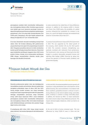 PT Pertamina Hulu Energi 127 2022Laporan TahunanAnnual ReportAnalisis dan Pembahasan ManajemenManagement Discussion and AnalysisOil and Gas Industry ReviewTinjauan Industri Minyak dan Gaspemangkasan produksi telah menimbulkan kekhawatiran atas meningkatnya tekanan inflasi. Demikian juga ancaman resesi global juga turut mewarnai persaingan investor ke depan di tengah perang di Ukraina yang belum ada kemajuan penyelesaian, serta Cina yang tetap mempertahankan ZeroCOVID policy. Dampaknya, nilai tukar Rupiah melemah dan ditutup di angka Rp15.617 per 16 Desember 2022. Di sisi lain, Pemerintah mencatat membaiknya kinerja fiskal selama 2022. Hal tersebut didukung oleh perekonomian yang tumbuh kuat mencapai 5,4% sampai dengan triwulan III 2022. Penguatan pemulihan ekonomi ini telah memberikan korelasi positif terhadap kinerja fiskal Indonesia. Pemerintah juga menjalankan pembiayaan anggaran tahun 2022 secara prudent, terukur, sinergis, serta menyesuaikan pembiayaan APBN dengan memperhatikan dinamika kondisi pasar keuangan dan likuiditas Pemerintah. PERKEMBANGAN INDUSTRI MINYAK DAN GAS Dinamika perekonomian global, risiko, dan ketidakpastian menyebabkan proyeksi pertumbuhan ekonomi global akan mengalami perlambatan tajam di tahun 2022 dan 2023. Seiring dengan kondisi tersebut, tren harga komoditas energi dunia masih sangat dipengaruhi oleh tensi geopolitik, sehingga menyebabkan penurunan harga komoditas energi. Lebih lanjut, keputusan OPEC+ untuk melakukan pemangkasan produksi telah menimbulkan kekhawatiran atas meningkatnya tekanan inflasi. Hal tersebut berdampak pada ketidakseimbangan permintaan dan pasokan hingga dapat memicu krisis energi.Di penghujung akhir tahun 2022, harga minyak tercatat tetap melemah. Hal tersebut dipengaruhi oleh kekhawatiran General ReviewTinjauan Umumto reduce production has stoked fears of rising inflationary pressures. In addition to the ongoing conflict in Ukraine and China's Zero COVID policy, the possibility of a global recession influenced the competition for investors in the future. As a result, the Rupiah exchange rate weakened and closed on 16 December 2022 at Rp15,617.In contrast, fiscal performance improved for the Government in 2022. This was supported by the robust growth of the economy, which reached 5.4% by the third quarter of 2022. This economic recovery's strengthening was positively correlated with Indonesia's fiscal performance. The Government is also carrying out financing for the 2022 budget in a prudent, measurable, synergistic manner, and adjusting State Budget (APBN) financing by taking into account the dynamics of financial market conditions and government liquidity.DEVELOPMENT OF THE OIL AND GAS INDUSTRYIn 2022 and 2023, the projected global economic growth will experience a sharp deceleration due to the dynamics of the global economy, risks, and uncertainties. In accordance with these conditions, geopolitical tensions continue to exert a strong influence on the trend of global energy commodity prices, resulting in a decline in energy commodity prices. In addition, the decision by OPEC+ to reduce production has raised concerns about rising inflationary pressures. This impacts demand-supply imbalances, which can lead to an energy crisis.At the end of 2022, oil prices remained weak. This was influenced by rising COVID-19 cases in China and the