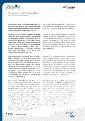130 PT Pertamina Hulu Energi 2022Laporan TahunanAnnual ReportAnalisis dan Pembahasan ManajemenManagement Discussion and Analysisteknologi dalam proses transisi demi mencapai target%u00a0Net Zero Emission (NZE)%u00a0global. Hal yang telah diupayakan adalah dengan menerapkan teknologi Carbon Capture and Storage/Carbon Capture, Utilization, and Storage (CCS/CCUS). Teknologi CCS/CCUS merupakan rangkaian pelaksanaan proses yang terkait satu sama lain, mulai dari pemisahan dan penangkapan (capture) CO2 dari sumber emisi gas buang (flue gas), pengangkutan CO2 tertangkap ke tempat penyimpanan (transportation), sampai penyimpanan ke tempat yang aman (storage). Pemisahan dan penangkapan CO2 dilakukan dengan teknologi absorpsi. Saat ini, terdapat 15 kegiatan CCS/CCUS di Indonesia yang masih dalam tahap studi/persiapan, namun sebagian besar ditargetkan%u00a0onstream%u00a0sebelum tahun 2030.Potensi dekarbonisasi di area upstream tersebar di berbagai lokasi, di antaranya yang saat ini sedang dilakukan studi adalah Jatibarang, Sukowati, Gundih, Ramba, Subang, Akasia Bagus, dan Betung. Secara total, potensi dekarbonisasi di seluruh area PHE Subholding Upstream ada di kisaran 15 juta ton CO2 eq. Penggunaan teknologi CCS/CCUS maka akan menjadi enabler yang mampu meningkatkan produksi migas melalui CO2-EOR sekaligus mengurangi emisi GRK secara signifikan. Implementasi teknologi%u00a0 baru ini tengah diuji coba di Jatibarang Field, Indramayu, Jawa Barat dengan melakukan injeksi perdana CO2.Selain melalui pemanfaatan teknologi terkini, upaya PHE Subholding Upstream dalam mendukung transisi energi yaitu dengan melakukan penghematan energi dan menjalankan program-program untuk menurunkan emisi GRK dari kegiatan operasional. Di luar kegiatan operasional, Perusahaan menjalankan kegiatan pemberdayaan masyarakat yang diarahkan untuk menciptakan program yang dapat meningkatkan keterampilan mereka, memberikan tambahan pendapatan, sekaligus dapat mengurangi emisi CO2 dengan cara mengembangkan energi baru dan terbarukan (EBT), optimalisasi energi tak terbarukan, hingga pengelolaan limbah menjadi sumber energi. Informasi lengkap mengenai inisiatif-inisiatif pengelolaan lingkungan dan pemberdayaan masyarakat dilaporkan dalam Laporan Keberlanjutan 2022. Oil and Gas Industry ReviewTinjauan Industri Minyak dan Gasand technology are necessary for the transition process. Carbon Capture and Storage/Carbon Capture, Utilization, and Storage (CCS/CCUS) technology has been attempted.CCS/CCUS technology consists of a series of interrelated processes, beginning with the separation and capture of CO2 from sources of flue gas, transport of captured CO2, and storage in a secure location. CO2 is separated and captured utilizing absorption technology. Currently, there are 15 CCS/CCUS activities in Indonesia that are still in the planning/study phase, but the majority of them are expected to be operational by 2030.Potential sites for decarbonization in the upstream region include Jatibarang, Sukowati, Gundah, Ramba, Subang, Akasia Bagus, and Betung, which are currently being studied. The potential for decarbonization in the PHE Subholding Upstream region is approximately 15 million tons CO2 eq. CCS/CCUS technology will become an enabler for increasing oil and gas production through CO2-EOR while reducing greenhouse gas emissions significantly. CO2 is being injected for the first time at Jatibarang Field, Indramayu, West Java, to test the implementation of this new technology.In addition to utilizing the latest technology, PHE Subholding Upstream's efforts to support the energy transition include energy conservation and the implementation of programs to reduce GHG emissions from operational activities. Outside of operational activities, the Company engages in community empowerment initiatives aimed at developing programs that can increase their skills, provide additional income, and reduce CO2 emissions by developing new and renewable energy (NRE), optimizing non-renewable energy, and transforming waste management into a source of energy. Comprehensive information on environmental management initiatives and community empowerment is provided in the 2022 Sustainability Report.