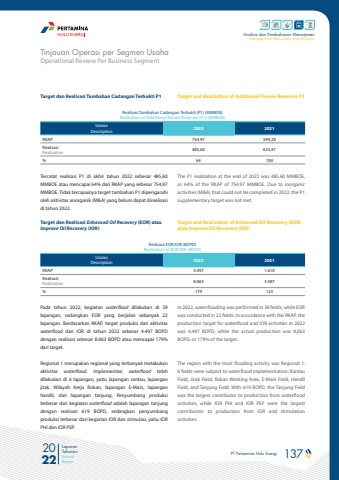 PT Pertamina Hulu Energi 137 2022Laporan TahunanAnnual ReportAnalisis dan Pembahasan ManajemenManagement Discussion and AnalysisOperational Review Per Business SegmentTinjauan Operasi per Segmen UsahaThe P1 realization at the end of 2022 was 485.60 MMBOE, or 64% of the RKAP of 754.97 MMBOE. Due to inorganic activities (M&A) that could not be completed in 2022, the P1 supplementary target was not met.Target and Realization of Enhanced Oil Recovery (EOR) atau Improve Oil Recovery (IOR)In 2022, waterflooding was performed in 39 fields, while EOR was conducted in 22 fields. In accordance with the RKAP, the production target for waterflood and IOR activities in 2022 was 4,497 BOPD, while the actual production was 8,063 BOPD, or 179% of the target.The region with the most flooding activity was Regional 1. 6 fields were subject to waterflood implementation: Rantau Field, Jirak Field, Rokan Working Area, E-Main Field, Handil Field, and Tanjung Field. With 619 BOPD, the Tanjung Field was the largest contributor to production from waterflood activities, while IOR PHI and IOR PEP were the largest contributors to production from IOR and stimulation activities.Target dan Realisasi Tambahan Cadangan Terbukti P1 Target and Realization of Additional Proven Reserves P1Realisasi Tambahan Cadangan Terbukti (P1) (MMBOE)Realization of Additional Proven Reserves (P1) (MMBOE)UraianDescription 2022 2021RKAP 754,97 599,28RealisasiRealization 485,60 623,47% 64 104Tercatat realisasi P1 di akhir tahun 2022 sebesar 485,60 MMBOE atau mencapai 64% dari RKAP yang sebesar 754,97 MMBOE. Tidak tercapainya target tambahan P1 dipengaruhi oleh aktivitas anorganik (M&A) yang belum dapat direalisasi di tahun 2022. Target dan Realisasi Enhanced Oil Recovery (EOR) atau Improve Oil Recovery (IOR)Realisasi EOR/IOR (BOPD)Realization of EOR/IOR (BOPD)UraianDescription 2022 2021RKAP 4.497 1.610RealisasiRealization 8.063 3.587% 179 123Pada tahun 2022, kegiatan waterflood dilakukan di 39 lapangan, sedangkan EOR yang berjalan sebanyak 22 lapangan. Berdasarkan RKAP, target produksi dari aktivitas waterflood dan IOR di tahun 2022 sebesar 4.497 BOPD dengan realisasi sebesar 8.063 BOPD atau mencapai 179% dari target. Regional 1 merupakan regional yang terbanyak melakukan aktivitas waterflood. Implementasi waterflood telah dilakukan di 6 lapangan, yaitu lapangan rantau, lapangan jirak, Wilayah Kerja Rokan, lapangan E-Main, lapangan handil, dan lapangan tanjung. Penyumbang produksi terbesar dari kegiatan waterflood adalah lapangan tanjung dengan realisasi 619 BOPD, sedangkan penyumbang produksi terbesar dari kegiatan IOR dan stimulasi, yaitu IOR PHI dan IOR PEP.