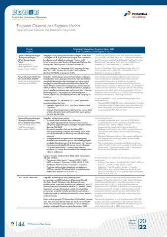 144 PT Pertamina Hulu Energi 2022Laporan TahunanAnnual ReportAnalisis dan Pembahasan ManajemenManagement Discussion and AnalysisOperational Review Per Business SegmentTinjauan Operasi per Segmen UsahaProyekProjectPenjelasan Singkat dan Progress Tahun 2022Brief Explanation and Progress in 2022Optimasi Pengembangan Lapangan-lapangan- (OPLL) Sanga Sanga Phase 1Optimizing the Development of Sanga Sanga Phase 1 (OPLL).Menjaga kelanjutan produksi PHSS dengan tambahan cadangan 4.8 BCF gas wellhead minyak dan kondensat. Lingkup proyek adalah pemboran 7 sumur infill beserta pemasangan flowline di lapangan Mutiara dan Pamaguan. Persetujuan FID bulan Oktober 2022.Sampai dengan 31 Desember 2022, ongoing drilling: MUT 321 (MUT F3) dan M-323 (MUT 953 OS) dan flowline MUT-DA2: in progress 15,8%.Continuing PHSS production with additional reserves of 4,8 billion cubic feet of oil and condensate wellhead gas. The project entails the drilling of 7 infill wells in the Mutiara and Pamaguan fields and the installation of flowlines. FID was approved in October 2022.As of 31 December 2022, ongoing drilling: MUT 321 (MUT F3) and M-323 (MUT 953 OS) and MUT-DA2 flowline: in progress at 15.8%.Pengembangan North Sisi dan North Nubi (NSNN)North Sisi and North Nubi Development (NSNN)Kegiatan ini bertujuan untuk memproduksi cadangan hidrokarbon dari Lapangan North Sisi dan North Nubi yang tidak terjangkau dari anjungan eksisting untuk menjaga kesinambungan produksi dari wilayah Sisi Nubi, dengan tambahan cadangan gas direncanakan sebesar 93 BSCF dan 1,57 MMSTB kondensat. Lingkup proyek adalah pemboran dan well connection 12 sumur, pembangunan 2 anjungan baru, pembangunan 2 subsea pipeline 10%u201d, dan pekerjaan tie-in ke 2 anjungan eksisting.Sampai dengan 31 Desember 2022, telah diperoleh progress sebagai berikut:%u2022 Rencana tajak RKAP 2022: 10 sumur, realisasi tajak : 12 sumur.%u2022 Seluruh lingkup pemboran dan koneksi sumur telah selesai, dan pekerjaan perforasi/clean up on going : SS-304, NB-401/406.This activity aims to produce hydrocarbon reserves from the North Sisi and North Nubi Fields that are inaccessible from existing platforms in order to maintain production continuity in the Sisi Nubi area. Additional gas reserves of 93 BSCFD and 1.57 MMSTB of condensate are planned. The project entails the drilling and connection of 12 wells, the construction of 2 new platforms, the installation of 2 10-inch subsea pipelines, and the connection of 2 existing platforms.As of December 31 2022, the following progress has been obtained:%u2022 Planned RKAP 2022: 10 wells, realized pitch: 12 wells.%u2022 The entire scope of well drilling and connection has been completed, and perforation/clean up work is on going for SS-304, NB-401/406.Optimasi Pengembangan Lapangan-lapangan (OPLL) Wilayah Kerja EKALEKAL Working Area Field Development Optimization (OPLL)Kegiatan ini bertujuan untuk: %u2022 Meningkatkan produksi dan cadangan lapangan-lapangan EKAL melalui sumur-sumur pengembangan dengan cadangan minyak 9 MMBO dan gas 130 BSCF.%u2022 Menjamin pasokan fuel gas ke kilang RU-V Balikpapan sebagai bagian dari sinergi antar anak usaha dan kontribusi terhadap ketahanan energi nasional.%u2022 Mempertahankan operasional lapangan yang memerlukan tambahan gas lift untuk mengangkat produksi likuidnya seperti di Sepinggan dan Santan.%u2022 Lingkup proyek adalah 30 sumur pengembangan (19 sumur area utara, 11 sumur area Selatan), workover 72 sumur, dan modifikasi fasilitas produksi 12 item pekerjaan.Sampai dengan 31 Desember 2022, telah berprogres sebagai berikut:%u2022 Pemboran : Plan Spud = 7 sumur (4 STA, 2 YKN, 1 SAPI) vs Actual = 12 sumur (1 YKN, 6 SAPI, 5 STA).%u2022 Workover : Plan 10 sumur vs Actual = 15 sumur.%u2022 Terdapat optimasi dan akselerasi pengeboran SAPI dan jumlah WO aktual lebih tinggi dari yang direncanakan (Plan 10 vs Actual 15).This activity aims to:%u2022 Increase production and reserves of EKAL fields via development wells containing 9 MMBO of oil reserves and 130 BSCF of gas reserves.%u2022 Guarantee the supply of fuel gas to the RU-V Balikpapan refinery as part of the synergy between subsidiaries and contribution to national energy security.%u2022 Maintain field operations in Sepinggan and Santan that require additional gas lifts to increase their liquid production.%u2022 The project scope encompasses 30 development wells (19 wells in the north area and 11 wells in the south area), 72 workover wells, and 12 work items for production facility modifications.As of December 31, 2022, the following progress has been made:%u2022 Drilling : Plan Spud = 7 wells (4 STA, 2 YKN, 1 SAPI) vs Actual = 12 wells (1 YKN, 6 SAPI, 5 STA).%u2022 Workover : Plan 10 wells vs Actual = 15 wells.%u2022 SAPI drilling was optimized and accelerated, and the actual number of WO is greater than anticipated (Plan 10 vs Actual 15).OPLL 2A WK Mahakam Kegiatan ini bertujuan untuk melanjutkan pengembangan WK Mahakam di lapangan Handil, Sisi Nubi, South Mahakam, dan Bekapai dengan penambahan kumulatif produksi gas sebesar 85,6 BSCF dan minyak serta kondensat sebesar 5,1 MMBBL. Selain itu proyek ini juga diharapkan untuk menahan laju penurunan produksi melalui pemboran sumur baru. Lingkup proyek ini adalah pemboran 56 sumur beserta well connection.Realisasi fisik proyek ITD Desember 2022 adalah sebesar 58% dari rencana sebesar 58% (on track). Sesuai RKAP 2022, rencana sumur tajak adalah 21 sumur dengan realisasi sebanyak 26 sumur pada Desember 2022.This activity aims to continue the development of the Mahakam WK in the Handil, Sisi Nubi, South Mahakam, and Bekapai fields with a cumulative increase in gas production of 85,6 BSCFD and oil and condensate production of 5.1 MMBBL. In addition, it is anticipated that this project will be able to withstand the rate of production decline caused by new well drilling. This project entails drilling 56 wells and connecting them together.The actual completion rate of the December 2022 ITD project was 58%, as op