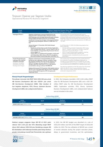 PT Pertamina Hulu Energi 145 2022Laporan TahunanAnnual ReportAnalisis dan Pembahasan ManajemenManagement Discussion and AnalysisOperational Review Per Business SegmentTinjauan Operasi per Segmen UsahaDevelopment Project PerformanceIn 2022, the Company recorded a USD 2,540 million RKAP value for ABI Business Development (BD) and a USD 591 million RKAP value for ABI Non-Business Development (NBD). Exploration activities, PDSI, Elnusa, Upstream Business Development (UBD), and undepreciated balance are not included in this value.In 2022, the ABI BD budget was absorbed at a rate of USD2,354 million and 93% of the RKAP target of USD2,540 million for 2022. The low utilization of ABI BD was a result of several obstacles during the project execution phase, delays in government incentives, and the optimization ProyekProjectPenjelasan Singkat dan Progress Tahun 2022Brief Explanation and Progress in 2022Sepinggan Phase 2 Kegiatan ini bertujuan memenuhi kebutuhan gas Pertamina RU-V memaksimalkan ultimate recovery (EUR) lapangan dan menjaga kesinambungan produksi. Ruang lingkup feasibility study (FS) ini mencakup pemboran 6 sumur baru dengan estimasi penambahan cadangan yang diharapkan sebesar 2,2 MBO dan 12,1 BCF.Sampai dengan 31 Desember 2022 telah dicapai progress sbb:%u2022 Pemboran pertama baru mulai di bulan September 2022 menggunakan Rig AE-1 (sumur Sejadi-2) dan di bulan Oktober menggunakan Rig Sinoocean Harvest(sumur Rajah-11).%u2022 Sumur SPG S-15: Drilling work in progress, mulai spudat 25 Desember 2022. Sumur SPG- R7: Completion plan direncanakan selesai pada akhir Desember 22).This activity aims to meet Pertamina RU-gas V's requirements in order to maximize the field's ultimate recovery (EUR) and maintain production continuity. This feasibility study (FS) encompasses the drilling of six new wells with additional reserves estimated at 2,2 MBO and 12,1 BCF.As of December 31 2022, the following progress has been achieved:%u2022 The first drilling started in September 2022 using Rig AE-1 (Sejadi-2 well) and in October using the Sinoocean Harvest Rig (Rajah-11 well).%u2022 SPG S-15 well: Drilling work in progress, starting spud at 25 December 2022. SPG-R7 well: Completion plan scheduled for by the end of 22 December).Proyek Pengembangan Lapangan Gas Unitisasi Jambaran-Tiung BiruJambaran-Tiung Biru Unitization Gas Field Development ProjectKegiatan ini bertujuan memproduksikan gas dan kondensat dari Lapangan Unitisasi Jambaran-Tiung Biru dengan produksi rata-rata raw gas sebesar 315 MMSCFD dengan sales gas sebesar 172 MMSCFD dengan impurities antara lain H2S, CO2 dan potensi penambahan sales gas sebesar 20 MMSCFD.Realisasi fisik proyek ITD Desember 2022 adalah sebesar 98,25%. Gas-In tercapai pada Agustus 2022, sedangkan Gas on Stream (GOS) kapasitas 20% tercapai pada September 2022.This activity aims to produce gas and condensate from the Jambaran-Tiung Biru Unitization Field with an average raw gas production of 315 MMSCFD, gas sales of 172 MMSCFD with impurities including H2S and CO2, and the potential of 20 MMSCFD in additional gas sales.The physical realization of the ITD project for December 2022 was 98.25%. Gas-In was achieved in August 2022, and Gas on Stream (GOS) with 20% capacity was achieved in September 2022.Kinerja Proyek PengembanganPerusahaan mencatat nilai RKAP 2022 USD2.540 juta untuk ABI Business Development (BD) dan USD591 juta untuk ABI Non-Business Development (NBD). Nilai tersebut di luar kegiatan eksplorasi, PDSI, Elnusa, Upstream Business Development (UBD), dan undepreciated balance. Realisasi Biaya ABI BDRealization of ABI BD CostsUraianDescription RKAP RealisasiRealization %ABI BD (USD Juta | Million USD) 2.540 2.354 93Realisasi Biaya ABI NBD Realization of ABI NBD CostsUraianDescription RKAP RealisasiRealization %ABI NBD (USD Juta | Million USD) 591 521 88Realisasi serapan anggaran biaya ABI BD di 2022 yakni sebesar USD 2.354 juta dan 93% dibanding target RKAP tahun 2022 sebesar USD2.540 juta. Rendahnya serapan ABI BD disebabkan oleh beberapa kendala pada tahap eksekusi proyek, tertundanya insentif dari Pemerintah, dan optimasi