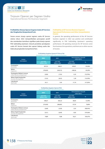 158 PT Pertamina Hulu Energi 2022Laporan TahunanAnnual ReportAnalisis dan Pembahasan ManajemenManagement Discussion and AnalysisOperational Review Per Business SegmentTinjauan Operasi per Segmen UsahaProfitabilitas Kinerja Operasi Segmen Usaha AP Services dan Penghasilan Komprehensif LainSecara umum, kinerja operasi segmen usaha AP Services selama tahun 2022 memperlihatkan pencapaian positif dan memberikan kontribusi signifikan pada kinerja operasi PHE Subholding Upstream. Seluruh perolehan pendapatan usaha AP Services berasal dari operasi bidang usaha dan tidak ada penghasilan komprehensif lain.Profitabilitas Kegiatan Operasi PT Elnusa TbkProfitability of PT Elnusa Tbk's Operational ActivitiesUraianDescription2022 2021 Pertumbuhan | Growth(2022:2021)Juta USDMillion USDJuta USDMillion USDJuta USDMillion USD %PendapatanRevenues 827,52 568,51 259,01 45,56%BebanExpenses (793,09) (544,73) -248,36 45,59%Pendapatan (Beban) LainnyaOther Revenue (Expenses) (2,00) (7,35) 5,35 (72,79%)Beban Pajak PenghasilanIncome Tax Expenses (7,32) (8,52) 1,20 (14,10%)Laba BersihNet Profit 25,11 7,92 17,19 217,05%Profitabilitas Kegiatan Operasi PDSIProfitability of PDSI%u2019s Operational ActivitiesUraianDescription2022 2021 Pertumbuhan | Growth(2022:2021)Juta USDMillion USDJuta USDMillion USDJuta USDMillion USD %PendapatanRevenues 340,27 302,22 38,05 12,59%BebanExpenses (314,40) (286,85) -27,55 9,60%Pendapatan (Beban) LainnyaOther Revenue (Expenses) (2,68) (5,20) 2,52 (48,53%)Beban Pajak PenghasilanIncome Tax Expenses (3,31) (0,49) -2,82 574,56%Laba BersihNet Profit 19,89 9,68 10,21 105,47%Profitability of AP Services Business Segment Operational Performance and Other Comprehensive IncomeIn general, the operating performance of the AP Services business segment in 2022 was positive and contributed significantly to PHE Subholding Upstream's operating performance. All operating revenues for AP Services come from business line operations, and there are no other sources of income.