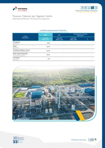 PT Pertamina Hulu Energi 159 2022Laporan TahunanAnnual ReportAnalisis dan Pembahasan ManajemenManagement Discussion and AnalysisProfitabilitas Kegiatan Operasi PT Badak NGLProfitability of PT Badak NGL%u2019s Operational ActivitiesUraianDescription2022 2021 Pertumbuhan | Growth(2022:2021)Juta USDMillion USDJuta USDMillion USDJuta USDMillion USD %PendapatanRevenues 10,83 - - - BebanExpenses (8,37) - - - Pendapatan (Beban) LainnyaOther Revenue (Expenses) (0,14) - - - Beban Pajak PenghasilanIncome Tax Expenses (0,67) - - - Laba BersihNet Profit 1,65 - - - Operational Review Per Business SegmentTinjauan Operasi per Segmen Usaha