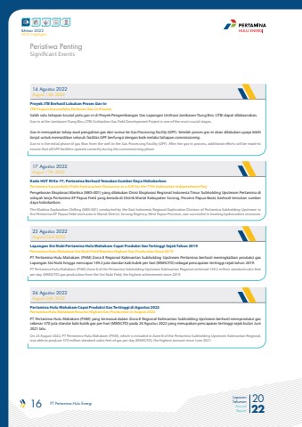 16 PT Pertamina Hulu Energi 2022Laporan TahunanAnnual ReportIkhtisar 20222022 Highlights14 Agustus 2022August 14th 202217 Agustus 2022August 17th 202223 Agustus 2022August 23rd 202224 Agustus 2022August 24th 2022Proyek JTB Berhasil Lakukan Proses Gas-InJTB Project Successfully Performs Gas-In ProcessSalah satu tahapan krusial yaitu gas-in di Proyek Pengembangan Gas Lapangan Unitisasi Jambaran-Tiung Biru (JTB) dapat dilaksanakan. Gas-in at the Jambaran-Tiung Biru (JTB) Unitization Gas Field Development Project is one of the most crucial stages.Gas-in merupakan tahap awal pengaliran gas dari sumur ke Gas Processing Facility (GPF). Setelah proses gas-in akan dilakukan upaya lebih lanjut untuk memastikan seluruh fasilitas GPF berfungsi dengan baik melalui tahapan commissioning.Gas-in is the initial phase of gas flow from the well to the Gas Processing Facility (GPF). After the gas-in process, additional efforts will be made to ensure that all GPF facilities operate correctly during the commissioning phase.Kado HUT RI Ke-77, Pertamina Berhasil Temukan Sumber Daya HidrokarbonPertamina Successfully Finds Hydrocarbon Resources as a Gift for the 77th Indonesian Independence DayPengeboran Eksplorasi Markisa (MKS-001) yang dilakukan Divisi Eksplorasi Regional Indonesia Timur Subholding Upstream Pertamina di wilayah kerja Pertamina EP Papua Field yang berada di Distrik Mariat Kabupaten Sorong, Provinsi Papua Barat, berhasil temukan sumber daya hidrokarbon.The Markisa Exploration Drilling (MKS-001) conducted by the East Indonesia Regional Exploration Division of Pertamina Subholding Upstream in the Pertamina EP Papua Field work area in Mariat District, Sorong Regency, West Papua Province, was successful in locating hydrocarbon resources.Lapangan Sisi Nubi Pertamina Hulu Mahakam Capai Produksi Gas Tertinggi Sejak Tahun 2019Pertamina Hulu Mahakam Sisi Nubi Field Reaches Highest Gas Production Since 2019PT Pertamina Hulu Mahakam (PHM) Zona 8 Regional Kalimantan Subholding Upstream Pertamina berhasil meningkatkan produksi gas Lapangan Sisi Nubi hingga mencapai 149.2 juta standar kaki kubik per hari (MMSCFD) sebagai pencapaian tertinggi sejak tahun 2019. PT Pertamina Hulu Mahakam (PHM) Zone 8 of the Pertamina Subholding Upstream Kalimantan Regional achieved 149.2 million standard cubic feet per day (MMSCFD) gas production from the Sisi Nubi Field, the highest achievement since 2019.Pertamina Hulu Mahakam Capai Produksi Gas Tertinggi di Agustus 2022Pertamina Hulu Mahakam Records Highest Gas Production in August 2022PT Pertamina Hulu Mahakam (PHM) yang termasuk dalam Zona 8 Regional Kalimantan Subholding Upstream berhasil memproduksi gas sebesar 570 juta standar kaki kubik gas per hari (MMSCFD) pada 24 Agustus 2022 yang merupakan pencapaian tertinggi sejak bulan Juni 2021 lalu. On 24 August 2022, PT Pertamina Hulu Mahakam (PHM), which is included in Zone 8 of the Pertamina Subholding Upstream Kalimantan Regional, was able to produce 570 million standard cubic feet of gas per day (MMSCFD), the highest amount since June 2021.Significant EventsPeristiwa Penting