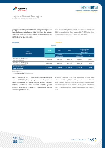 PT Pertamina Hulu Energi 165 2022Laporan TahunanAnnual ReportAnalisis dan Pembahasan ManajemenManagement Discussion and AnalysisFinancial Performance ReviewTinjauan Kinerja Keuanganbasis for calculating the UOP Rate. The reserves reported by D&M are smaller than those reported by PHE. The top three contributors were PEP, PHE ONWJ, and PHE OSES.As of 31 December 2022, the Company's liabilities were valued at USD16,323.51 million, an increase of 8.20% from the prior year's USD15,087.00 million. The increase in liabilities was due to an increase in long-term liabilities of USD 2,128.88 million or 25.04% compared to the previous year.Per 31 Desember 2022, Perusahaan memiliki liabilitas sebesar USD16.323,51 juta yang tercatat naik 8,20% dari tahun lalu sebesar USD15.087,00 juta. Adanya kenaikan liabilitas disebabkan oleh kenaikan liabilitas jangka Panjang sebesar USD2.128,88 juta atau sebesar 25,04% dibandingkan tahun lalu.LiabilitasLiabilitasLiabilitiesUraianDescription2022 2021* 2020*PertumbuhanGrowth(2022:2021)Juta USDMillion USDJuta USDMillion USD %Liabilitas Jangka PendekCurrent Liabilities 5.691,67 6.584,03 4.268,20 (892,36) (13,55)Liabilitas Jangka PanjangNon-Current Liabilities 10.631,84 8.502,97 7.654,97 2.128,88 25,04Jumlah LiabilitasTotal Liabilities 16.323,51 15.087,00 11.923,17 1.236,52 8,20Catatan | Notes:*) Penyajian kembali | RestatementLiabilitiespenggunaan cadangan D&M dalam basis perhitungan UOP Rate. Cadangan pada laporan D&M lebih kecil dari laporan cadangan internal PHE. Penyumbang terbesar berasal dari PEP, PHE ONWJ dan PHE OSES.