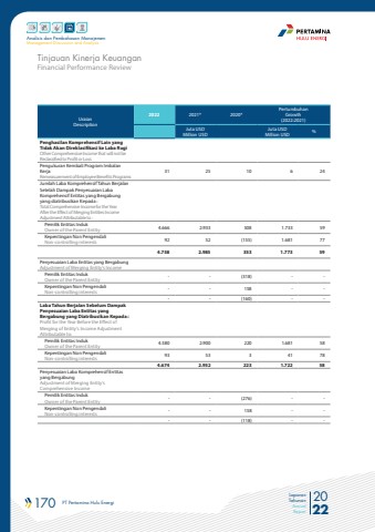 170 PT Pertamina Hulu Energi 2022Laporan TahunanAnnual ReportAnalisis dan Pembahasan ManajemenManagement Discussion and AnalysisFinancial Performance ReviewTinjauan Kinerja KeuanganUraianDescription2022 2021* 2020*PertumbuhanGrowth(2022:2021)Juta USDMillion USDJuta USDMillion USD %Penghasilan Komprehensif Lain yang Tidak Akan Direklasifikasi ke Laba RugiOther Comprehensive Income that will not be Reclassified to Profit or LossPengukuran Kembali Program Imbalan KerjaRemeasurement of Employee Benefits Programs31 25 10 6 24Jumlah Laba Komprehensif Tahun Berjalan Setelah Dampak Penyesuaian Laba Komprehensif Entitas yang Bergabung yang diatribusikan Kepada :Total Comprehensive Income for the Year After the Effect of Merging Entities Income Adjustment Attributable to :Pemilik Entitas IndukOwner of the Parent Entity 4.666 2.933 508 1.733 59Kepentingan Non PengendaliNon-controlling interests 92 52 (155) 1.681 77 4.758 2.985 353 1.773 59Penyesuaian Laba Entitas yang BergabungAdjustment of Merging Entity's IncomePemilik Entitas IndukOwner of the Parent Entity - - (318) - -Kepentingan Non PengendaliNon-controlling interests - - 158 - -- - (160) - -Laba Tahun Berjalan Sebelum Dampak Penyesuaian Laba Entitas yang Bergabung yang Diatribusikan Kepada :Profit for the Year Before the Effect of Merging of Entity's Income Adjustment Attributable to:Pemilik Entitas IndukOwner of the Parent Entity 4.580 2.900 220 1.681 58Kepentingan Non PengendaliNon-controlling interests 93 53 3 41 784.674 2.952 223 1.722 58Penyesuaian Laba Komprehensif Entitas yang BergabungAdjustment of Merging Entity's Comprehensive IncomePemilik Entitas IndukOwner of the Parent Entity - - (276) - -Kepentingan Non PengendaliNon-controlling interests - - 158 - -- - (118) - -