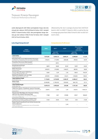 PT Pertamina Hulu Energi 175 2022Laporan TahunanAnnual ReportAnalisis dan Pembahasan ManajemenManagement Discussion and AnalysisFinancial Performance ReviewTinjauan Kinerja Keuanganinfluenced by the rise in average oil prices from US$70.24/barrel in 2021 to US$97.71/barrel in 2022, as well as the rise in average gas prices from US$6.75/mscf in 2021 to US$7.67/mscf in 2022.usaha dipengaruhi oleh faktor peningkatan harga rata-rata minyak dari sebesar US$70,24/barel di tahun 2021 menjadi US$97,71/barel di tahun 2022. dan peningkatan harga ratarata gas dari sebesar US$6,75/mscf di tahun 2021 menjadi US$7,67/mscf di tahun 2022.Laba (Rugi) Komprehensif Comprehensive Profit (Loss)UraianDescription2022 2021* 2020*PertumbuhanGrowth(2022:2021)Juta USDMillion USDJuta USDMillion USD %Laba UsahaOperating Profit 7.672,81 5.073,12 2.067,27 2.599,69 51,24Penyisihan Penurunan Nilai Aset Non KeuanganProvision for impairment of non-financial assets (165,61) (115,99) (662,68) (49,62) 42,78Penyisihan Penurunan Nilai GoodwillProvision for impairment of Goodwill - (0.41) - - -Penghasilan KeuanganFinance Income 48,99 30,00 45,92 18,99 63,30Beban KeuanganFinance Cost (243,91) (153,98) (165,07) (89,93) 58,40Keuntungan/(Kerugian) Selisih KursForeign exchange gain, net 53,83 5,29 1,34 48,54 916,79(Beban)/Pendapatan Lain-Lain NetoOther (Expense)/Income, Net (247,87) (103,05) (16,21) (144,82) 140,53Laba Sebelum PajakProfit Before Tax 7.118,25 4.734,98 1.302,97 2.383,27 50,33Beban PajakTax Expenses (2.444,09) (1.782,34) (918,94) (661,74) 37,13Laba Setelah PajakProfit After Tax 4.674,16 2.952,64 223,96 1.721,52 58,30Selisih Kurs Karena Penjabaran Laporan KeuanganExchange Difference Due to Explanation of Financial Statements(24,91) (1,30) 1,55 (23,61) 1.816,15Penyesuaian Nilai Wajar atas Instrumen Lindung Nilai Arus Kas Setelah Dikurangi PajakFair Value Adjustment of Cash Flow Hedging Instruments After Tax77,88 8,41 (47,88) 69,47 826,04Pengukuran Kembali Program Imbalan KerjaRemeasurement of Employee Benefits Programs 31,02 25,46 10,45 5,56 21,84Bagian Rugi Komprehensif Lain Entitas Asosiasi dan Ventura BersamaShare of Other Comprehensive Loss of Associates and Joint Ventures- - 5,18 - -