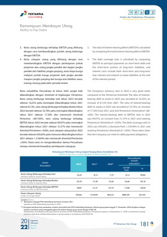 PT Pertamina Hulu Energi 181 2022Laporan TahunanAnnual ReportAnalisis dan Pembahasan ManajemenManagement Discussion and AnalysisAbility to Pay DebtsKemampuan Membayar Utang3. The ratio of interest-bearing debt to EBITDA is calculated by comparing the total interest-bearing debt to EBITDA. 4. The debt coverage ratio is calculated by comparing EBITDA to principal payments on short-term debt and the short-term portion of long-term liabilities, and interest costs include both short-term and long-term loan interest and interest on lease liabilities at the end of the relevant period. The Company's solvency ratio in 2022 is very good when compared to the Pertamina threshold. The ratio of interestbearing debt to assets in 2022 was recorded at 16.25%, an increase of 8.13% from 2021. The ratio of interest-bearing debt to equity in 2022 was recorded at 33.76%, an increase of 17.30% from 2021, and met Pertamina's threshold of <80-100%. The interest-bearing debt to EBITDA ratio in 2022 was 49.07%, an increase from 31.27% in 2021 and meeting Pertamina's threshold of <350%. The debt coverage ratio in 2022 was 429.65%, a decrease from 1,318.94% in 2021 and meeting Pertamina's threshold of >250%. These ratios show that the Company can meet its debt payment obligations. 3. Rasio utang berbunga terhadap EBITDA yang dihitung dengan cara membandingkan jumlah utang berbunga dengan EBITDA.4. Rasio cakupan utang yang dihitung dengan cara membandingkan EBITDA dengan pembayaran pokok pinjaman atas utang jangka pendek dan bagian jangka pendek dari liabilitas jangka panjang, serta biaya bunga meliputi jumlah bunga pinjaman baik jangka pendek maupun jangka panjang dan bunga atas liabilitas sewa, masing-masing pada akhir periode terkait.Rasio solvabilitas Perusahaan di tahun 2022 sangat baik dibandingkan dengan threshold di lingkungan Pertamina. Rasio utang berbunga terhadap aset tahun 2022 tercatat sebesar 16,25% yaitu meningkat dibandingkan tahun 2021 sebesar 8,13%, rasio utang berbunga terhadap ekuitas tahun 2022 tercatat sebesar 33,76% yaitu meningkat dibandingkan tahun 2021 sebesar 17,30% dan memenuhi threshold Pertamina <80-100%, rasio utang berbunga terhadap EBITDA tahun 2022 tercatat sebesar 49,07% yaitu meningkat dibandingkan tahun 2021 sebesar 31,27% dan memenuhi threshold Pertamina <350%, rasio cakupan utang tahun 2022 tercatat sebesar 429,65% yaitu menurun dibandingkan tahun 2021 sebesar 1.318,94% dan memenuhi threshold Pertamina >250%. Rasio-rasio ini mengindikasikan bahwa Perusahaan mampu memenuhi kewajiban pembayaran utangnya.Kemampuan Membayar Utang Jangka Panjang (Rasio Solvabilitas) (%)Ability to Pay Non-Current Payables (Solvency Ratio) (%)UraianDescription 2022 2021* 2020*PertumbuhanGrowth(2022:2021)JumlahTotal %Rasio Utang Berbunga terhadap AsetInterest Debt to Asset Ratio 16,25 8,13 7,75 8,12 99,85Rasio Utang Berbunga terhadap EkuitasInterest Debt to Equity Ratio 33,76 17,30 14,26 16,46 95,18Rasio Utang Berbunga terhadap EBITDAInterest Debt to EBITDA Ratio 49,07 31,27 47,73 17,80 56,94Rasio Cakupan UtangDebt Coverage Ratio 429,65 1.318,94 863,52 (889,29) (67,42)Catatan | Notes:*) Beroperasi sebagai PHE Subholding Upstream di tahun 2021. Operate as PHE Subholding Upstream in 2021.**) Penyajian kembali atas perubahan struktur tata kelola dari PHE Subholding Upstream. Ekuitas grup pada tanggal 31 Desember 2020 disajikan sebagai ekuitas unit bisnis yang menggabungkan diri dalam ekuitas grup sesuai dengan PSAK 38. Restatement of changes to the governance structure of PHE Subholding Upstream. The group's equity as of December 31, 2020 is presented as equity business units that combine themselves in group equity in accordance with PSAK 38.