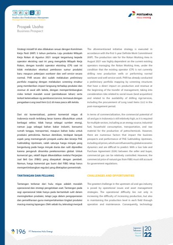 196 PT Pertamina Hulu Energi 2022Laporan TahunanAnnual ReportAnalisis dan Pembahasan ManajemenManagement Discussion and AnalysisStrategi inisiatif di atas dilakukan sesuai dengan Komitmen Kerja Pasti (KKP) 5 tahun pertama. Laju produksi Wilayah Kerja Rokan di Agustus 2021 sangat tergantung kepada operator eksisting saat ini yang mengelola Wilayah Kerja Rokan, dengan kondisi operator eksisting (CPI) saat ini tidak melakukan eksekusi pemboran sumur produksi baru maupun pekerjaan workover dan well service secara normal. PHR secara dini sudah melakukan preliminaryportfolio mapping dengan melakukan screening struktur yang memberikan impact langsung terhadap produksi dan revenue di awal alih kelola, dengan mempertimbangkan risiko terkait masalah sosial (pembebasan lahan) serta terkait ketersediaan rig pemboran/service, termasuk dengan pengadaan Long Lead Item (LLI) di masa pasca alih kelola.Dari sisi komersialisasi, potensi komersial migas di Indonesia masih terbilang besar karena dibutuhkan untuk berbagai sektor, tidak hanya sebagai sumber energi, namun juga sebagai bahan bakar industri, konsumsi rumah tangga, transportasi, maupun bahan baku untuk produksi petrokimia. Namun demikian, terdapat banyak aspek yang memengaruhi prospek usaha dan kinerja PHE Subholding Upstream, salah satunya harga minyak yang bergantung pada harga minyak dunia dan sulit diprediksi karena pengaruh dinamika perekonomian global. Untuk komersial gas, relatif dapat dikendalikan melalui Perjanjian Jual Beli Gas (PJBG) yang disepakati dengan pembeli. Namun, harga komersial gas bumi dari PJBG tetap harus mempertimbangkan regulasi yang ditetapkan pemerintah. TANTANGAN DAN PELUANGTantangan terbesar dari hulu migas adalah masalah operasional dan strategi pengelolaan aset. Tantangan pada segi operasional tidak hanya pada bertambah sulit dalam meningkatkan produksi, tetapi juga dalam pengoperasian dan pemeliharaan guna mempertahankan tingkat produksi masing-masing lapangan. Oleh sebab itu, teknologi menjadi Business ProspectProspek UsahaThe aforementioned initiative strategy is executed in accordance with the first 5-year Definite Work Commitment (KKP). The production rate for the Rokan Working Area in August 2021 was highly dependent on the current existing operators managing the Rokan Working Area, under the condition that the existing operator (CPI) is not currently drilling new production wells or performing normal workover and well service work. PHR has already conducted a preliminary portfolio mapping by screening structures that have a direct impact on production and revenue at the beginning of the transfer of management, taking into consideration risks related to social issues (land acquisition) and related to the availability of drilling rigs/services, including the procurement of Long Lead Items (LLI) in the post-management period.In terms of commercialization, the commercial potential of oil and gas in Indonesia is still relatively high, as it is required for multiple sectors, including as an energy source, industrial fuel, household consumption, transportation, and raw material for the production of petrochemicals. However, there are numerous factors that impact the business prospects and performance of PHE Subholding Upstream, including oil prices, which are influenced by global economic dynamics and are difficult to predict. With a Gas Sale and Purchase Agreement (GSA) between the seller and buyer, commercial gas can be relatively controlled. However, the commercial price of natural gas from PJBG must still account for government regulations.CHALLENGES AND OPPORTUNITIESThe greatest challenge in the upstream oil and gas industry is posed by operational issues and asset management strategies. The operational difficulty lies not only in increasing the difficulty of increasing production, but also in maintaining the production level in each field through operation and maintenance. Consequently, technology