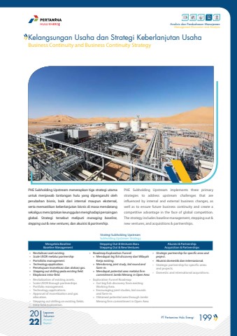 PT Pertamina Hulu Energi 199 2022Laporan TahunanAnnual ReportAnalisis dan Pembahasan ManajemenManagement Discussion and AnalysisPHE Subholding Upstream menerapkan tiga strategi utama untuk menjawab tantangan hulu yang dipengaruhi oleh perubahan bisnis, baik dari internal maupun eksternal, serta memastikan keberlanjutan bisnis di masa mendatang sekaligus menciptakan keunggulan menghadapi persaingan global. Strategi tersebut meliputi managing baseline, stepping out & new ventures, dan akuisisi & partnership.Strategi Subholding UpstreamSubholding Upstream StrategyMengelola BaselineBaseline ManagementStepping Out & Ventures BaruStepping Out & New VenturesAkuisisi & PartnershipAcquisition & Partnerships%u2022 Revitalisasi aset existing.%u2022 Scale I/EOR melalui partnership%u2022 Portofolio management.%u2022 Technology application.%u2022 Persetujuan monetisasi dan alokasi gas.%u2022 Stepping out drilling pada existing field.%u2022 Eksplorasi intra-field.%u2022 Revitalization of existing assets.%u2022 Scale I/EOR through partnerships%u2022 Portfolio management.%u2022 Technology applications.%u2022 Approval of monetization and gas allocation.%u2022 Stepping out drilling on existing fields.%u2022 Intra-field exploration.%u2022 Roadmap Exploration Funnel%u00bb Mendapat big fish discovery dari Wilayah Kerja existing.%u00bb Mendorong joint study, bid round and farm-in.%u00bb Mendapat potential area melalui firm commitment Jambi Merang in Open Area%u2022 Exploration Funnel Roadmap%u00bb Got big fish discovery from existing Working Area.%u00bb Encouraging joint studies, bid rounds and farm-in.%u00bb Obtained potential area through Jambi Merang firm commitment in Open Area%u2022 Strategic partnership for specific area and project.%u2022 Akuisisi domestik dan internasional.%u2022 Strategic partnership for specific areas and projects.%u2022 Domestic and international acquisitions.Kelangsungan Usaha dan Strategi Keberlanjutan UsahaBusiness Continuity and Business Continuity StrategyPHE Subholding Upstream implements three primary strategies to address upstream challenges that are influenced by internal and external business changes, as well as to ensure future business continuity and create a competitive advantage in the face of global competition. The strategy includes baseline management, stepping out & new ventures, and acquisitions & partnerships.