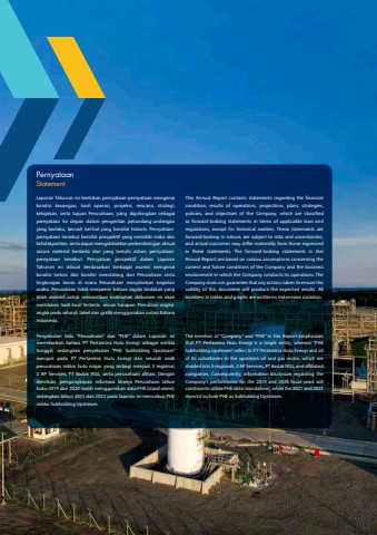 PernyataanStatementLaporan Tahunan ini berisikan pernyataan-pernyataan mengenai kondisi keuangan, hasil operasi, proyeksi, rencana, strategi, kebijakan, serta tujuan Perusahaan, yang digolongkan sebagai pernyataan ke depan dalam pengertian perundang-undangan yang berlaku, kecuali hal-hal yang bersifat historis. Pernyataanpernyataan tersebut bersifat prospektif yang memiliki risiko dan ketidakpastian, serta dapat mengakibatkan perkembangan aktual secara material berbeda dari yang tertulis dalam pernyataanpernyataan tersebut. Pernyataan prospektif dalam Laporan Tahunan ini dibuat berdasarkan berbagai asumsi mengenai kondisi terkini dan kondisi mendatang dari Perusahaan serta lingkungan bisnis di mana Perusahaan menjalankan kegiatan usaha. Perusahaan tidak menjamin bahwa segala tindakan yang telah diambil untuk memastikan keabsahan dokumen ini akan membawa hasil-hasil tertentu sesuai harapan. Penulisan angkaangka pada seluruh tabel dan grafik menggunakan notasi Bahasa Indonesia.Penyebutan kata %u201cPerusahaan%u201d dan %u201cPHE%u201d dalam Laporan ini menekankan bahwa PT Pertamina Hulu Energi sebagai entitas tunggal, sedangkan penyebutan %u201cPHE Subholding Upstream%u201d merujuk pada PT Pertamina Hulu Energi dan seluruh anak perusahaan sektor hulu migas yang terbagi menjadi 5 regional, 2 AP Services, PT Badak NGL, serta perusahaan afiliasi. Dengan demikian, pengungkapan informasi kinerja Perusahaan tahun buku 2019 dan 2020 masih menggunakan data PHE (stand alone), sedangkan tahun 2021 dan 2022 pada laporan ini mencakup PHE selaku Subholding Upstream.This Annual Report contains statements regarding the financial condition, results of operations, projections, plans, strategies, policies, and objectives of the Company, which are classified as forward-looking statements in terms of applicable laws and regulations, except for historical matters. These statements are forward-looking in nature, are subject to risks and uncertainties, and actual outcomes may differ materially from those expressed in these statements. The forward-looking statements in this Annual Report are based on various assumptions concerning the current and future conditions of the Company and the business environment in which the Company conducts its operations. The Company does not guarantee that any actions taken to ensure the validity of this document will produce the expected results. All numbers in tables and graphs are written in Indonesian notation.The mention of %u201cCompany%u201d and %u201cPHE%u201d in this Report emphasizes that PT Pertamina Hulu Energi is a single entity, whereas %u201cPHE Subholding Upstream%u201d refers to PT Pertamina Hulu Energi and all of its subsidiaries in the upstream oil and gas sector, which are divided into 5 regionals, 2 AP Services, PT Badak NGL, and affiliated companies. Consequently, information disclosure regarding the Company%u2019s performance for the 2019 and 2020 fiscal years will continue to utilize PHE data (standalone), while the 2021 and 2022 reportsl include PHE as Subholding Upstream.