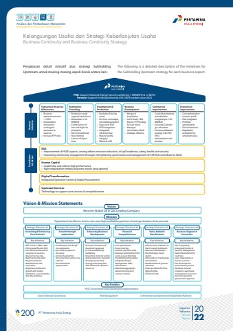 200 PT Pertamina Hulu Energi 2022Laporan TahunanAnnual ReportAnalisis dan Pembahasan ManajemenManagement Discussion and AnalysisBusiness Continuity and Business Continuity StrategyKelangsungan Usaha dan Strategi Keberlanjutan UsahaSubsurface: Reserves & Resources%u2022 Reserves replacement ratio > 100%%u2022 Acceleration maturation contingent resources to reserves%u2022 Increase RTP ratioExploration Funneling%u2022 Borderless study regional skala basin%u2022 Maturation %u2265 50 MMBOE%u2022 Combination of low and high risk prospects%u2022 Non Conventional%u2022 New Venture%u2022 Seismic di Open AreaDevelopment & Production%u2022 Revitalize Existing assets%u2022 On time, on budget, onschedule projects%u2022 Step out & EOR%u2022 POD Integration%u2022 Integrated infrastructure%u2022 Mature facility integrity%u2022 Effective ASRBusiness Development%u2022 Merger & Acquisition%u2022 Joint Study / Bid Round / PI Privilege for new block%u2022 Manager termination block%u2022 Strategic AllianceCommercial Improvement%u2022 Crude Monetization, stranded dan marginal gas (<25 MMBOE)%u2022 Securing GSA dan gas allocation%u2022 Commercialization synergy (C&T, KPI, SHG)%u2022 Monetization side productEconomical Improvement%u2022 Cost optimization%u2022 Increase profit%u2022 Risk mitigation%u2022 Portfolio optimization%u2022 Fiscal incentives%u2022 Regulation evaluation to unlocked valueESG%u2022 Improvement of HSSE aspects, among others emission reduction, oil spill readiness, safety, health and security%u2022 Improving community engagement through strengthening governance and management of CSR that contribute to SDGsHuman Capital%u2022 Leadership and culture high performance%u2022 Agile organization melalui business proses yang optimalDigital TransformationIntegrated Operation Center & Digital ProcurementUpstream ServicesTechnology to support core services & competitivenessPHE: Support National Energy Security achieving 1 MMBOPD & 12 BCFDPersero: Support Holding achieving USS 100 B market value 2024Business Initiatives Foundation InitiativesBecome Global Oil & Gas Leading CompanyOperational excellence, best in class and high profitable upstream oil and gas business that promote HSSE, Environment Social Governance ImplementationGood Corporate GovernanceVision & Mission StatementsVisionMissionKey EnablesSustaining & Enhancing Core BusinessStrategic Directions #1Key InitiativesStrategic Directions #2Key InitiativesStrategic Directions #3Key InitiativesStrategic Directions #4Key InitiativesStrategic Directions #5Key InitiativesStrategic Directions #6Key InitiativesGrowth through explorationAdvancing Business DevelopmentFinancial CompetitivenessValue Added &New BusinessBusiness Support & Innovation%u2022 RTP 1P min 7, RRR>100%%u2022 Fitting waterflood & EOR%u2022 Fast track transformation resources to reserves%u2022 Step out & new play%u2022 Reactivation idle wells%u2022 Project excellence%u2022 Abandonment site restoration%u2022 Alignment production growth with project milestones, asset reliability & facility readiness%u2022 Combination low & high risk exploration%u2022 Fast track prospect to discovery%u2022 Accelerate potential discovery from seismic new ventures%u2022 Unconventional opportunities%u2022 Fast track investment & divestment approval%u2022 In time and flexibility budgeting%u2022 Streamline maturity system%u2022 Global expansion & growth%u2022 Strategic partnership%u2022 Synergy work programs with Pertamina upstream service co%u2022 Cost optimization%u2022 Fiscal incentive%u2022 Unblock portfolio value%u2022 Revenue optimization from crude assay & blending%u2022 Flexibility funding option%u2022 Integrated Project Management (IPM) effectiveness%u2022 Maximize aggregation demand & long-term contract scheme%u2022 Infrastructure readiness to match supply & demand%u2022 Reserves monetization%u2022 Shortlisted gas buyer system%u2022 Side product, stranded gas monetization%u2022 Decarbonation & greener operation%u2022 Scale up LNG & LPG Hub Opportunities%u2022 CCUS/CCS Hub%u2022 Fast Computing%u2022 Integrated System & Security Management%u2022 Talent development & readiness%u2022 Lean organization & business process%u2022 Fair & transparent procurement process%u2022 Optimize material inventory, warehouse management & services%u2022 Fast track permit & government approvalRisk Management Community development and Stakeholder RelationsThe following is a detailed description of the initiatives for the Subholding Upstream strategy for each business aspect:Penjabaran detail inisiatif atas strategi Subholding Upstream untuk masing-masing aspek bisnis antara lain: