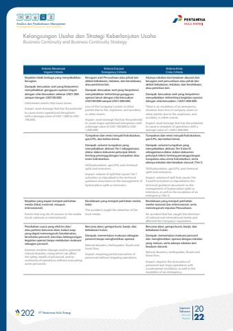 202 PT Pertamina Hulu Energi 2022Laporan TahunanAnnual ReportAnalisis dan Pembahasan ManajemenManagement Discussion and AnalysisBusiness Continuity and Business Continuity StrategyKelangsungan Usaha dan Strategi Keberlanjutan UsahaKriteria MendesakUrgent CriteriaKriteria DaruratEmergency CriteriaKriteria KrisisCrisis CriteriaKejadian tidak terduga yang menyebabkan kerugian.Dampak: kerusakan aset yang berpotensi menyebabkan gangguan operasi ringan dengan nilai kerusakan sebesar USD1.000 sampai dengan USD100.000.Unforeseen events that cause losses.Impact: asset damage that has the potential to cause minor operational disruptions with a damage value of USD 1,000 to USD 100,000.Kerugian aset Perusahaan atau pihak lain akibat kebakaran, ledakan, dan kecelakaan, atau peristiwa lain.Dampak: kerusakan aset yang berpotensi menyebabkan terhentinya gangguan operasi besar dengan nilai kerusakan USD100.000 sampai USD1.000.000.Loss of the Company's assets or other parties due to fire, explosion, and accident, or other events.Impact: asset damage that has the potential to cause major operational disruptions with a damage value of USD 100,000 to USD 1,000,000.Adanya eskalasi dari keadaan darurat dari kerugian aset perusahaan atau pihak lain akibat kebakaran, ledakan, dan kecelakaan, atau peristiwa lain.Dampak: kerusakan aset yang berpotensi menyebabkan terhentinya kegiatan operasi dengan nilai kerusakan >USD1.000.000.There is an escalation of an emergency situation from loss of company assets or other parties due to fire, explosion, and accident, or other events.Impact: asset damage that has the potential to cause a cessation of operations with a damage value of >USD1,000,000.Tumpahan dan emisi minyak/hidrokarbon, gas/LPG, dan bahan kimia.Dampak: volume tumpahan yang menyebabkan aktivasi Tier I sebagaimana diatur dalam dokumen petunjuk teknis tentang penanggulangan tumpahan atau emisi hidrokarbon.Oil/hydrocarbon, gas/LPG, and chemical spills and emissions.Impact: volume of spill that causes Tier I activation as stipulated in the technical guidance document on the management of hydrocarbon spills or emissions.Tumpahan dan emisi minyak/hidrokarbon, gas/LPG, dan bahan kimia.Dampak: volume tumpahan yang menyebabkan aktivasi Tier II dan III sebagaimana diatur dalam dokumen petunjuk teknis tentang penanggulangan tumpahan atau emisi hidrokarbon, serta adanya eskalasi dari keadaan darurat (Tier I).Oil/hydrocarbon, gas/LPG, and chemical spills and emissions.Impact: volume of spill that causes Tier II and III activation as stipulated in the technical guidance document on the management of hydrocarbon spills or emissions, as well as the escalation of an emergency (Tier I).Kejadian yang dapat menjadi perhatian media (lokal, nasional, maupun internasional).Events that may be of concern to the media (local, national, or international).Kecelakaan yang menjadi perhatian media lokal.The accident caught the attention of the local media.Kecelakaan yang menjadi perhatian media nasional dan internasional, serta memengaruhi reputasi Perusahaan.An accident that has caught the attention of national and international media and affected the Company's reputation.Perubahan cuaca yang ekstrim dan/atau potensi bencana alam, kabut asap yang dapat memengaruhi keselamatan, kesehatan personil, dan/atau kelangsungan kegiatan operasi tanpa melakukan evakuasi sebagian personil.Extreme weather changes and/or potential natural disasters, smog which can affect the safety, health of personnel, and/or continuity of operations without evacuating some personnel.Bencana alam, gempa bumi, banjir, dan kebakaran hutan.Dampak: memerlukan evakuasi sebagian personil tanpa menghentikan operasi.Natural disasters, earthquakes, floods and forest fires.Impact: requiring partial evacuation of personnel without stopping operations.Bencana alam, gempa bumi, banjir, dan kebakaran hutan.Dampak: memerlukan evakuasi personil dan menghentikan operasi dengan eskalasi yang meluas, serta adanya eskalasi dari keadaan darurat.Natural disasters, earthquakes, floods and forest fires.Impact: requires the evacuation of personnel and stops operations with a widespread escalation, as well as the escalation of an emergency.