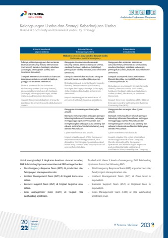 PT Pertamina Hulu Energi 203 2022Laporan TahunanAnnual ReportAnalisis dan Pembahasan ManajemenManagement Discussion and AnalysisBusiness Continuity and Business Continuity StrategyKelangsungan Usaha dan Strategi Keberlanjutan UsahaTo deal with these 3 levels of emergency, PHE Subholding Upstream forms the following ERO:%u2022 Site Emergency Response Team (ERT) at production site/field/project site/exploration site.%u2022 Incident Management Team (IMT) at Zone level or equivalent.%u2022 Business Support Team (BST) at Regional level or equivalent.%u2022 Crisis Management Team (CMT) at PHE Subholding Upstream level.Untuk menghadapi 3 tingkatan keadaan darurat tersebut, PHE Subholding Upstream membentuk ERO sebagai berikut:%u2022 Site Emergency Response Team (ERT) di production site/field/project site/exploration site.%u2022 Incident Management Team (IMT) di tingkat Zona atau setara.%u2022 Business Support Team (BST) di tingkat Regional atau setara.%u2022 Crisis Management Team (CMT) di tingkat PHE Subholding Upstream.Kriteria MendesakUrgent CriteriaKriteria DaruratEmergency CriteriaKriteria KrisisCrisis CriteriaWabah (outbreak) atau kondisi darurat medisOutbreak or medical emergencyAdanya potensi gangguan dan ancaman keamanan (security threat), demonstrasi (civil unrest), sandera (hostage), sabotase (sabotage), pemogokan (strike), dan terorisme (terrorism).Dampak: Memerlukan mobilisasi bantuan keamanan untuk mencegah terjadinya gangguan/ancaman keamanan.There is potential for disturbances and security threats (security threats), demonstrations (civil unrest), hostages (hostage), sabotage (sabotage), strikes (strikes), and terrorism (terrorism).Impact: Requires mobilization of security assistance to prevent security disturbances/threats.Gangguan dan ancaman keamanan (security threat), demonstrasi (civil unrest), sandera (hostage), sabotase (sabotage), pemogokan (strike), blokade, atau terorisme (terrorism).Dampak: memerlukan evakuasi sebagian personil tanpa menghentikan operasi.Disturbances and security threats (security threats), demonstrations (civil unrest), hostages (hostage), sabotage (sabotage), strikes (strikes), blockades, or terrorism (terrorism).Impact: requiring partial evacuation of personnel without stopping operations.Gangguan dan ancaman keamanan (security threat), demonstrasi (civil unrest), sandera (hostage), sabotase (sabotage), pemogokan (strike), blokade, atau terorisme (terrorism).Dampak: adanya eskalasi dari Keadaan Darurat dan/atau mengaktifkan Business Continuity Plan (BCP).Disturbances and security threats (security threats), demonstrations (civil unrest), hostages (hostage), sabotage (sabotage), strikes (strikes), blockades, or terrorism (terrorism).Impact: there is an escalation of the State of Emergency and/or activating the Business Continuity Plan (BCP).Gangguan dan serangan siber (cyber attack).Dampak: melumpuhkan sebagian jaringan teknologi informasi Perusahaan, sehingga mengganggu operasi Perusahaan dan menghilangkan sebagian data penting dan rahasia (critical and confidential data) yang dimiliki Perusahaan.Cyber interference and attacks.Impact: disabling part of the Company's information technology network, thus disrupting the Company's operations and eliminating some of the Company's critical and confidential data.Gangguan dan serangan siber (cyber attack).Dampak: melumpuhkan seluruh jaringan teknologi informasi Perusahaan, sehingga mengganggu operasi Perusahaan dan menghilangkan seluruh data penting dan rahasia (critical and confidential data) yang dimiliki Perusahaan.Cyber interference and attacks.Impact: crippled the entire information technology network of the Company, thereby disrupting the Company's operations and eliminating all important and confidential data (critical and confidential data) owned by the Company.