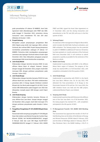 208 PT Pertamina Hulu Energi 2022Laporan TahunanAnnual ReportAnalisis dan Pembahasan ManajemenManagement Discussion and AnalysisInformasi Penting LainnyaInformasi Penting LainnyaPIREP and EMIL signed the Asset Sales Agreement on 31 December 2022, and the closing transaction and amendments to the TSC and JOA will occur in the first quarter of 2023.3. Saluang ProjectAn extension of the management of Algeria's Block 405A, which includes the MLN field, Ourhood unitization, and EMK unitization. The Saluang project has the potential to yield 137 MMBOE in additional 2P reserves. Pertamina has been granted a 6--month extension of the Ourhood field since December 2022. It will continue to submit proposals as quickly as possible for the extension of the block as a whole.4. Melati Joint StudyImplemented in partnership with KNOC in the offshore Manui Basin region of Sulawesi. The progress of the study has reached 89% as of 28 December 2022, with completion anticipated in the first quarter of 2023.5. Joint Study BungaImplemented in partnership with POSCO in the North East Java Basin offshore area. On 26 July 2022, PHE delivered the final presentation of JS Bunga to the Directorate General of Oil and Gas. On 6 June 2022, the UBD initiation forum was held and the UBD project, codenamed Brantas Project, was initiated.6. Serpang Joint Study Implemented in partnership with Petronas in the offshore area of the East Java Basin. As of 28 December 2022, the study progress has reached 41% , with completion anticipated in the 4th quarter of 2023.7. PI Management Transfer 10% BUMD SIAK Working AreaThe Government has approved the transfer of 10% PI of Siak Working Area via the letter of the Minister of Energy and Mineral Resources (ESDM) dated 8 February 2022 and the letter of SKK Migas dated 21 February 2022. PT Riau Petroleum Siak is the BUMD holding a 10% PI. A pada penambahan 2P sebesar 59 MMBOE. Asset Sales Agreement telah ditandatangani oleh PIREP dan EMIL pada tanggal 31 Desember 2022, sementara closing transaction serta amandemen TSC dan JOA akan dilakukan di triwulan 1-2023.3. Proyek SaluangMerupakan proyek perpanjangan pengelolaan Blok 405A Algeria yang terdiri dari lapangan MLN, unitisasi Ourhood, dan unitisasi EMK. Proyek Saluang berpotensi memberikan penambahan cadangan 2P sebesar 137 MMBOE. Pertamina telah mendapatkan perpanjangan sementara atas lapangan Ourhood selama 6 bulan sejak Desember 2022. Akan dilanjutkan pengajuan proposal perpanjangan blok secara keseluruhan secepatnya. 4. Joint Study MelatiDilaksanakan dengan bermitra bersama KNOC di area offshore Manui Basin di wilayah Sulawesi. Sampai dengan tanggal 28 Desember 2022, progres studi telah mencapai 89% dengan perkiraan penyelesaian pada triwulan 1 tahun 2023. 5. Joint Study BungaDilaksanakan dengan bermitra bersama POSCO di area offshore North East Java Basin. PHE telah melaksanakan presentasi akhir JS Bunga kepada Direktorat Jenderal Minyak dan Gas Bumi pada tanggal 26 Juli 2022. Forum inisiasi UBD dilaksanakan pada tanggal 6 Juni 2022 dan dilanjutkan menjadi project UBD dengan sandi ProjectBrantas. 6. Joint Study SerpangDilaksanakan dengan bermitra bersama Petronas di area offshore East Java Basin. Sampai dengan tanggal 28 Desember 2022, progres studi telah mencapai 41% dengan perkiraan penyelesaian pada triwulan 4 tahun 2023.7. Pengalihan Pengelolaan PI 10% BUMD Wilayah Kerja SIAKPemerintah telah menyetujui pengalihan PI 10% Wilayah Kerja Siak melalui surat Menteri Energi dan Sumber Daya Mineral (ESDM) No.T-46/MG.04/MEM.M/2022 tanggal 8 Februari 2022 dan surat SKK Migas No.SRT-0037/SKKMI0000/2022/S9 tanggal 21 Februari 2022. BUMD