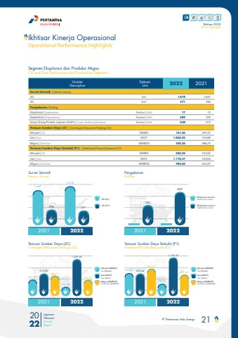 PT Pertamina Hulu Energi 21 2022Laporan TahunanAnnual ReportIkhtisar 20222022 HighlightsUraianDescriptionSatuanUnit 2022 2021Survei Seismik | Seismic Survey2D km 1.818 1.6473D km2 371 396Pengeboran | DrillingEksplorasi | Exploration Sumur | Well 17 12Eksploitasi | Exploitation Sumur | Well 689 350Kerja Ulang Pindah Lapisan (KUPL) | Layer-Shifting Workover Sumur | Well 638 472Temuan Sumber Daya (2C) | Contingent Resources Findings (2C)Minyak | Oil MMBO 161,46 397,47Gas | Gas BSCF 1.065,45 516,98Migas | Oil & Gas MMBOE 345,36 486,70Temuan Sumber Daya Terbukti (P1) | Additional Proven Resources (P1)Minyak | Oil MMBO 282,56 532,05Gas | Gas BSCF 1.176,37 529,64Migas | Oil & Gas MMBOE 485,60 623,47Segmen Eksplorasi dan Produksi Migas Oil and Gas Exploration and Production SegmentSurvei SeismikSeismic SurveyTemuan Sumber Daya (2C)Contingent Resources Findings (2C)Temuan Sumber Daya Terbukti (P1) Additional Proven Resources (P1)PengeboranDrilling20212021 20212022 20212022 202220221.647397,47532,05161,46282,56121.81817396516,98 529,641.065,45 1.176,37486,70623,47345,36485,603503716892D (km)3D (km2)Eksplorasi (sumur)Exploration (well)Minyak (MMBO)Oil (MMBO)Minyak (MMBO)Oil (MMBO)Eksploitasi (sumur)Exploitation (well)Gas (BSCF)Gas (BSCF)Gas (BSCF)Gas (BSCF)Migas (MMBOE)Oil & Gas (MMBOE)Migas (MMBOE)Oil & Gas (MMBOE)Ikhtisar Kinerja OperasionalOperational Performance Highlights