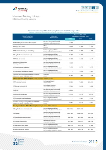PT Pertamina Hulu Energi 211 2022Laporan TahunanAnnual ReportAnalisis dan Pembahasan ManajemenManagement Discussion and AnalysisInformasi Penting LainnyaInformasi Penting LainnyaRealisasi Transaksi dengan Pihak Berelasi yang Bertransaksi dan Sifat Hubungan AfiliasiRealized Transactions with Transacting Parties and Nature of Affiliated RelationshipsNama PerusahaanCompany NameHubunganRelationshipsTransaksi (Ribu USD)Transaction (Thousand USD)2022 2021 2020PT Bank Rakyat Indonesia (Persero) Tbk Berelasi dengan PemerintahRelated to the Government 7.468 - -PT Migas Hulu Jabar MitraPartner 7.037 17.484 5.854PT Pertamina Training & Consulting Entitas SepengendalianEntity under Common Control 6.794 5.797 3.288Kilang Pertamina Internasional Entitas SepengendalianEntity under Common Control 5.189 5.254 -PT Pelita Air Service Entitas SepengendalianEntity under Common Control 5.150 3.660 3.147Kementerian KeuanganMinistry of FinanceBerelasi dengan PemerintahRelated to the Government 4.064 - -PT Tugu Pratama Indonesia Entitas SepengendalianEntity under Common Control 1.446 2.515 3.615PT Pertamina Geothermal Energy Entitas SepengendalianEntity under Common Control - 2.853 5.302Lain-lain masing-masing dibawah USD4.000Others are under USD4,000 eachLain-lainOther 6.585 463 1.358Utang Lain-lain - Pihak Berelasi | Other Payables - Related PartiesPT Pertamina Persero Pemegang SahamShareholder 76.705 71.582 231.474PT Donggi Senoro LNG Perusahaan AsosiasiAssociate Company 31.586 21.672 9.602MMPKM Berelasi dengan PemerintahRelated to the Government 23.058 - -Kementerian Keuangan Berelasi dengan PemerintahRelated to the Government 21.419 21.419 21.419PT Pertamina Bina Medika IHC Entitas SepengendalianEntity under Common Control - 4.361 2.129Lain-lain masing-masing dibawah USD4.000Others are under USD4,000 eachLain-lainOther 4.987 6.412 4.761Pendapatan Usaha - Pihak Berelasi | Operating Income - Related PartiesKilang Pertamina Internasional Entitas SepengendalianEntity under Common Control 8.924.966 2.559.872 -SKK Migas Berelasi dengan PemerintahRelated to the Government 1.585.162 1.540.323 927.324PT Pupuk Indonesia (Persero) Berelasi dengan PemerintahRelated to the Government 626.708 687.904 566.556PT Donggi Senoro LNG Perusahaan AsosiasiAssociate Company 587.265 249.037 260.336PT Pertamina Patra Niaga Entitas SepengendalianEntity under Common Control 460.513 345.618 57.466PT Perusahaan Gas Negara Entitas SepengendalianEntity under Common Control 399.142 429.028 413.863