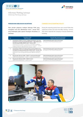 214 PT Pertamina Hulu Energi 2022Laporan TahunanAnnual ReportAnalisis dan Pembahasan ManajemenManagement Discussion and AnalysisInformasi Penting LainnyaInformasi Penting LainnyaCHANGES IN ACCOUNTING POLICYDuring the reporting period, there were several PSAKs that underwent revision and came into effect starting 1 January 2022 which impacted the Company's Financial Statements, including:PERUBAHAN KEBIJAKAN AKUNTANSI Pada periode pelaporan terdapat beberapa PSAK yang mengalami revisi dan diberlakukan mulai 1 Januari 2022 yang berdampak pada Laporan Keuangan Perusahaan, di antaranya:No. Perubahan PSAKPSAK ChangesDampak bagi Laporan KeuanganImpact on Financial Statements1 Amandemen PSAK 57: Provisi, Liabilitas Kontinjensi, dan Aset Kontinjensi tentang Kontrak Memberatkan %u2013 Biaya Memenuhi Kontrak yang berlaku efektif mulai 1 Januari 2022Amendments to PSAK 57: Provisions, Contingent Liabilities, and Contingent Assets regarding Onerous Contracts %u2013 Cost of Fulfilling Contracts effective from January 1, 2022Tidak berdampak pada Laporan KeuanganNo impact on the Financial Statements2 Amandemen PSAK 22: Kombinasi Bisnis tentang Referensi ke Kerangka Konseptual yang berlaku efektif mulai 1 Januari 2022Amendments to PSAK 22: Business Combinations regarding Reference to the Conceptual Framework effective January 1, 2022Tidak berdampak pada Laporan KeuanganNo impact on the Financial Statements3 Penyesuaian Tahunan 2020 %u2013 PSAK 71: Instrumen Keuangan2020 Annual Adjustment %u2013 PSAK 71: Financial InstrumentsTidak berdampak pada Laporan KeuanganNo impact on the Financial Statements4 Penyesuaian Tahunan 2020 %u2013 PSAK 73: Sewa2020 Annual Adjustment %u2013 PSAK 73: RentTidak berdampak pada Laporan KeuanganNo impact on the Financial Statements