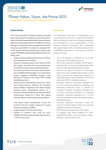 218 PT Pertamina Hulu Energi 2022Laporan TahunanAnnual ReportTata Kelola Perusahaan yang BaikGood Corporate GovernanceDASAR HUKUM Dasar hukum penerapan tata kelola perusahaan yang baik (good corporate governance/GCG) yang utama bagi sebuah Badan Usaha Milik Negara (BUMN) adalah Peraturan Menteri Badan Usaha Milik Negara Nomor Per-01/MBU/2011 tentang Penerapan Tata Kelola Perusahaan yang Baik (Good Corporate Governance) pada BUMN. Di samping itu, penerapan GCG di PHE sebagai Subholding Upstream juga mengacu pada regulasi PERTAMINA sebagai Holding BUMN Minyak dan Gas (Migas), yakni:%u00bb Undang-Undang Republik Indonesia Nomor 40 Tahun 2007 tentang Perseroan Terbatas;%u00bb Keputusan Pemegang Saham Secara Sirkuler (KPSSS) PHE tanggal 1 September 2021 tentang Implementasi Pembentukan Legal End-State Subholding Upstream;%u00bb Surat Keputusan Direksi PT Pertamina (Persero) Nomor Kpts-19/C00000/2020-S0 tanggal 16 Juni 2020 tentang Struktur Organisasi Subholding Upstream, yang menunjuk PT Pertamina Hulu Energi (%u201cPHE%u201d) sebagai Subholding Upstream;%u00bb Peraturan Komisi Pemberantasan Korupsi No. 2 Tahun 2014 tentang Pedoman Pelaporan dan Penetapan Status Gratifikasi sebagaimana telah diubah dengan Peraturan Komisi Pemberantasan Korupsi No. 6 Tahun 2015 tentang Perubahan atas Peraturan Komisi Pemberantasan Korupsi No. 2 Tahun 2014 tentang Pedoman Pelaporan dan Penetapan Status Gratifikasi.%u00bb Surat Edaran Komisi Pemberantasan Korupsi No. B.1341/01-13-03-2017 tanggal 15 Maret 2017 perihal Pedoman dan Batasan Gratifikasi.%u00bb Anggaran Dasar PT Pertamina Hulu Energi.%u00bb Pedoman PT Pertamina Hulu Energi No A-003/PHE040/2018-S9 Rev.0 tentang Perilaku dan Etika Bisnis %u2013 Code of Conduct (CoC).LEGAL BASISThe fundamental legal basis for implementing good corporate governance (GCG) for a State-Owned Enterprise (SOE) is the Minister of State-Owned Enterprises Regulation No. Per-01/MBU/2011 on the Implementation of Good Corporate Governance throughout SOEs. Furthermore, GCG implementation in PHE as Subholding Upstream refers to PERTAMINA regulations as a state-owned oil and gas holding, specifically:%u00bb Law of the Republic of Indonesia No. 40 of 2007 concerning Limited Liability Companies;%u00bb PHE Circular Shareholder Resolution (KPSSS) dated 1 September 2021 concerning the Implementation of the Legal End-State Subholding Upstream Formation;%u00bb Decree of the Board of Directors of PT Pertamina (Persero) No. Kpts-19/C00000/2020-S0 dated 16 June 2020 concerning the Organizational Structure of Subholding Upstream, which designates PT Pertamina Hulu Energi (%u201cPHE%u201d) as Subholding Upstream;%u00bb Corruption Eradication Commission Regulation No. 2 of 2014 concerning Guidelines for Reporting and Determining Gratification Status as amended by Corruption Eradication Commission Regulation No. 6 of 2015 concerning Amendments to Corruption Eradication Commission Regulation No. 2 of 2014 concerning Guidelines for Reporting and Determination of Gratification Status.%u00bb Corruption Eradication Commission Circular No. B.1341/01-13-03-2017 dated 15 March 2017 regarding Guidelines and Limits of Gratification.%u00bb PT Pertamina Hulu Energi Articles of Association.%u00bb PT Pertamina Hulu Energi Guidelines No A-003/PHE040/2018-S9 Rev.0 concerning Business Conduct and Ethics %u2013 Code of Conduct (CoC).Dasar Hukum, Tujuan, dan Prinsip GCGLegal Basis, Purpose, and Principles of GCG