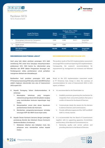 224 PT Pertamina Hulu Energi 2022Laporan TahunanAnnual ReportTata Kelola Perusahaan yang BaikGood Corporate GovernanceREKOMENDASI DAN TINDAK LANJUTHasil yang baik dalam penilaian penerapan GCG telah mendorong PHE untuk terus berupaya menyempurnakan pelaksanaan GCG. Oleh karena itu, rekomendasi yang diberikan dari BPKP (Badan Pengawasan Keuangan dan Pembangunan) selaku penilai/asesor untuk perbaikan manajemen ditelaah dan ditindaklanjuti.Berdasarkan hasil penilaian penerapan GCG pada PT Pertamina Hulu Energi (PHE) tahun 2022 oleh BPKP, berikut adalah ringkasan rekomendasi atas area of improvement (AOI) aspek GCG:A. Kepada Pemegang Saham direkomendasikan, diantaranya:1. Menetapkan ketentuan yang mengatur mekanisme pengunduran diri dari jabatan rangkap yang menimbulkan benturan kepentingan bagi Direksi.2. Menyampaikan secara jelas alasan keputusanpemberhentian Direksi dan Komisaris.3. Memberikan pengesahan/persetujuan terhadaprancangan RJPP dan RKAP secara tepat waktu.B. Kepada Dewan Komisaris bersama dengan perangkatpendukung (Komite dan Sekretaris Dewan Komisaris)direkomendasikan, di antaranya:1. Melakukan telaahan atas kebijakan mutu danpelayanan serta memberikan arahan kepadaDireksi.RECOMMENDATIONS AND FOLLOW-UPSThe positive results of the GCG implementation assessment encourage PHE to continue improving GCG implementation. Consequently, the assessor%u2019s recommendations for improvement by management are reviewed and followed up.Based on the GCG implementation assessment results at PT Pertamina Hulu Energi in 2022, the summary of recommendations for areas of improvement (AOI) in GCG aspect, as follows:A. It is recommended to the Shareholders to:1. Establish provisions governing the mechanism forresignation from concurrent positions that pose aconflict of interest for the Board of Directors.2. Communicate clearly the reasons for the decisionto dismiss Directors and Commissioners.3. Provide ratification/approval of the RJPP and RKAP draft in a timely manner.B. It is recommended that the Board of Commissionerstogether with its supporting apparatus (Committeesand Secretary of the Board of Commissioners) to:1. Reviewing quality and service policies andproviding direction to the Board of Directors.GCG AssessmentPenilaian GCGNo Aspek PenilaianAssessment AspectBobotWeightEvaluasi Tahun 20222022 Evaluation KategoriCategory SkorScore (%)5 Pengungkapan Informasi dan TransparansiInformation and Transparency Disclosure9,000 8,308 92,311 Sangat BaikVery Good6 Aspek LainnyaOther Aspects5,000 0,000 - -Skor Keseluruhan Overall Score100,000 85,052 85,052 Sangat BaikVery Good