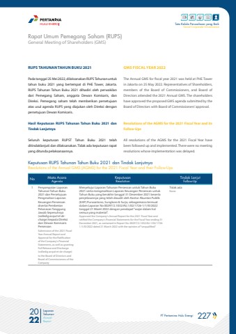 PT Pertamina Hulu Energi 227 2022Laporan TahunanAnnual ReportTata Kelola Perusahaan yang BaikGood Corporate GovernanceRUPS TAHUNAN TAHUN BUKU 2021Pada tanggal 25 Mei 2022, dilaksanakan RUPS Tahunan untuk tahun buku 2021 yang bertempat di PHE Tower, Jakarta. RUPS Tahunan Tahun Buku 2021 dihadiri oleh perwakilan dari Pemegang Saham, anggota Dewan Komisaris, dan Direksi. Pemegang saham telah memberikan persetujuan atas usul agenda RUPS yang diajukan oleh Direksi dengan persetujuan Dewan Komisaris.Hasil Keputusan RUPS Tahunan Tahun Buku 2021 dan Tindak LanjutnyaSeluruh keputusan RUPST Tahun Buku 2021 telah ditindaklanjuti dan dilaksanakan. Tidak ada keputusan rapat yang ditunda pelaksanaannya.GMS FISCAL YEAR 2022The Annual GMS for fiscal year 2021 was held at PHE Tower in Jakarta on 25 May 2022. Representatives of Shareholders, members of the Board of Commissioners, and Board of Directors attended the 2021 Annual GMS. The shareholders have approved the proposed GMS agenda submitted by the Board of Directors with Board of Commissioners%u2019 approval.Resolutions of the AGMS for the 2021 Fiscal Year and its Follow-UpsAll resolutions of the AGMS for the 2021 Fiscal Year have been followed up and implemented. There were no meeting resolutions whose implementation was delayed.No Mata AcaraAgendaKeputusanResolutionTindak LanjutFollow-Up1 Penyampaian Laporan Tahunan Tahun Buku 2021 dan Persetujuan Pengesahan Laporan Keuangan Perseroan disertai Pemberian Pelunasan Tanggung Jawab Sepenuhnya (volledig acquit et decharge) kepada Direksi dan Dewan Komisaris Perseroan Submission of the 2021 Fiscal Year Annual Report and Approval for the Ratification of the Company's Financial Statements, as well as granting Full Release and Discharge (volledig acquit et de-charge) to the Board of Directors and Board of Commissioners of the CompanyMenyetujui Laporan Tahunan Perseroan untuk Tahun Buku 2021 serta mengesahkan Laporan Keuangan Perseroan untuk Tahun Buku yang berakhir tanggal 31 Desember 2021 beserta penjelasannya yang telah diaudit oleh Kantor Akuntan Publik (KAP) Purwantono, Sungkoro & Surja, sebagaimana termuat dalam Laporan No 00297/2.1032/AU.1/02/1726-1/1/III/2022 tanggal 21 Maret 2022 dengan pendapat %u201cwajar dalam hal semua yang material%u201d.Approved the Company's Annual Report for the 2021 Fiscal Year and ratified the Company's Financial Statements for the Fiscal Year ending 31 December 2021, as contained in Report No. 00297/2.1032/AU.1/02/1726-1/1/III/2022 dated 21 March 2022 with the opinion of %u201cunqualified.\Tidak adaNoneKeputusan RUPS Tahunan Tahun Buku 2021 dan Tindak LanjutnyaResolutions of the Annual GMS (AGMS) for the 2021 Fiscal Year and their Follow-UpsGeneral Meeting of Shareholders (GMS)Rapat Umum Pemegang Saham (RUPS)