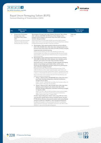 228 PT Pertamina Hulu Energi 2022Laporan TahunanAnnual ReportTata Kelola Perusahaan yang BaikGood Corporate GovernanceNo Mata AcaraAgendaKeputusanResolutionTindak LanjutFollow-Up2 Pengusulan Penetapan Penggunaan Laba Perseroan Tahun Buku 2021Proposal for the Determination of the Use of the Company%u2019s Profit for the 2021 Fiscal YearMenetapkan Penggunaan Laba Ditahan Perseroan Tahun Buku 2021 sebesar USD2.888.105.000 (dua miliar delapan ratus delapan puluh delapan juta seratus lima ribu Dolar Amerika Serikat) sebagai berikut:Determined the use of USD2,888,105,000 (two billion eight hundred eighty-eight million one hundred and five thousand United States dollars) in Retained Earnings for the 2021 Fiscal Year as follows:a. Menetapkan saldo appropriated retained earning sebesar USD1.582.250.000 (satu miliar lima ratus delapan puluh dua juta dua ratus lima puluh ribu Dolar Amerika Serikat) menjadi unappropriated retained earning;Determined the balance of USD1,582,250,000 (one billion five hundred eighty-two million two hundred and fifty thousand United States Dollars) in appropriated retained earnings as unappropriated retained earnings;b. Menetapkan total unappropriated retained earning sebesar USD2.888.105.000 (dua miliar delapan ratus delapan puluh delapan juta seratus lima ribu Dolar Amerika Serikat), termasuk huruf a. di atas sebagai Dividen kepada Pemegang Saham sesuai dengan porsi kepemilikan saham pada Perseroan dan dibayarkan dengan mekanisme pembayaran cash settlement sebagai berikut:Determined the total unappropriated retained earnings of USD 2,888,105,000 (two billion eight hundred eighty-eight million one hundred and five thousand United States Dollars), including the letter a. above, as Shareholder Dividends in accordance with the portion of share ownership in the Company and paid with the following cash settlement payment mechanism:i. Tahap 1 sebesar USD1.500.000.000 (satu miliar lima ratus juta Dolar Amerika) dibayarkan selambat-lambatnya tanggal 30 Juni 2022;Phase 1 of USD 1,500,000,000 (one billion five hundred million US Dollars) paid no later than 30 June 2022;ii. Tahap 2 sebesar USD1.388.105.000 (satu miliar tiga ratus delapan puluh delapan juta seratus lima ribu Dolar Amerika Serikat) dibayarkan selambat-lambatnya tanggal 31 Agustus 2022.iPhase 2 of USD 1,388,105,000 (one billion three hundred eightyeight million one hundred and five thousand United States Dollars) paid no later than 31 August 2022.Dividen dapat dibayarkan dalam mata uang USD dan mata uang Rupiah setelah berkoordinasi terlebih dahulu dengan PT Pertamina (Persero). Konversi ke dalam mata uang Rupiah mengacu pada kurs JISDOR H-1 dari tanggal pembayaran.Dividends are payable in USD and Rupiah after prior coordination with PT Pertamina (Persero). The Rupiah conversion rate refers to the JISDOR H-1 rate as from the date of payment.Tidak adaNoneGeneral Meeting of Shareholders (GMS)Rapat Umum Pemegang Saham (RUPS)