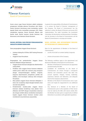 PT Pertamina Hulu Energi 233 2022Laporan TahunanAnnual ReportTata Kelola Perusahaan yang BaikGood Corporate GovernanceSecara umum, tugas Dewan Komisaris adalah melakukan pengawasan terhadap jalannya Perusahaan oleh Direksi. Dewan Komisaris berwenang untuk memberikan nasihat kepada Direksi serta memastikan penerapan GCG. Dalam menjalankan tugasnya, Dewan Komisaris dibantu oleh Komite Audit, Komite Investasi, Komite Nominasi dan Remunerasi, serta Sekretaris Dewan Komisaris.DASAR, KRITERIA, DAN PROSES PENGANGKATAN ANGGOTA DEWAN KOMISARISDasar pengangkatan Anggota Dewan Komisaris:%u00bb Undang-Undang No. 40 Tahun 2007 tentang Perseroan Terbatas.%u00bb Anggaran Dasar Perusahaan.Pengangkatan dan pemberhentian Anggota Dewan Komisaris dilakukan dengan ketentuan:%u00bb Anggota Dewan Komisaris diangkat dan diberhentikan melalui RUPS;%u00bb Pemilihan calon anggota Dewan Komisaris dilakukan melalui proses seleksi dan nominasi yang transparan dengan mempertimbangkan keahlian, integritas, kejujuran, kepemimpinan, pengalaman, perilaku dan dedikasi, serta kecukupan waktunya demi kemajuan Perusahaan;%u00bb Masa jabatan anggota Dewan Komisaris ditetapkan 3 tahun dan sesudahnya dapat diangkat kembali untuk satu kali masa jabatan;%u00bb Pemberhentian sewaktu-waktu anggota Dewan Komisaris sebelum berakhirnya masa jabatan harus dilakukan oleh RUPS dengan menyebutkan alasannya dan dengan terlebih dahulu memberikan kesempatan kepada anggota Dewan Komisaris tersebut untuk membela diri sesuai ketentuan yang berlaku.In general, the responsibility of the Board of Commissioners is to oversee the Board of Directors%u2019 management of the Company. The Board of Commissioners has the authority to advise the Board of Directors and ensure GCG implementation. The Audit Committee, the Investment Committee, the Nomination and Remuneration Committee, and the Secretary to the Board of Commissioners aid the Board of Commissioners in carrying out its duties.BASIS, CRITERIA, AND APPOINTMENT PROCESS OF THE BOARD OF COMMISSIONERSBasis for the appointment of Members of the Board of Commissioners:%u00bb Law No. 40 of 2007 on Limited Liability Companies%u00bb Articles of Association of the Company.The following conditions apply to the appointment and dismissal of Members of the Board of Commissioners:%u00bb Members of the Board of Commissioners are appointed and dismissed by the GMS;%u00bb Candidates for membership on the Board of Commissioners are chosen through a transparent selection and nomination process that takes into account expertise, integrity, honesty, leadership, experience, behavior and dedication, and adequate time for the Company%u2019s advancement;%u00bb Members of the Board of Commissioners serve 3-year terms and maybe be reappointed for one additional term;%u00bb Any dismissal of a Member of the Board of Commissioners prior to the expiration of their tenure must be made by the GMS, with reasons stated, after the Member has been given an opportunity to defend themselves in accordance with applicable regulations.Dewan KomisarisBoard of Commissioners
