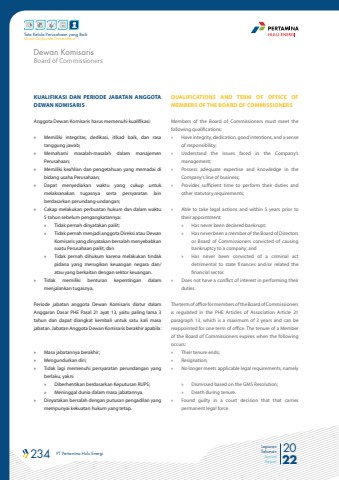 234 PT Pertamina Hulu Energi 2022Laporan TahunanAnnual ReportTata Kelola Perusahaan yang BaikGood Corporate GovernanceKUALIFIKASI DAN PERIODE JABATAN ANGGOTA DEWAN KOMISARISAnggota Dewan Komisaris harus memenuhi kualifikasi:%u00bb Memiliki integritas, dedikasi, itikad baik, dan rasa tanggung jawab;%u00bb Memahami masalah-masalah dalam manajemen Perusahaan;%u00bb Memiliki keahlian dan pengetahuan yang memadai di bidang usaha Perusahaan;%u00bb Dapat menyediakan waktu yang cukup untuk melaksanakan tugasnya serta persyaratan lain berdasarkan perundang-undangan;%u00bb Cakap melakukan perbuatan hukum dan dalam waktu 5 tahun sebelum pengangkatannya:%u00bb Tidak pernah dinyatakan pailit;%u00bb Tidak pernah menjadi anggota Direksi atau Dewan Komisaris yang dinyatakan bersalah menyebabkan suatu Perusahaan pailit; dan%u00bb Tidak pernah dihukum karena melakukan tindak pidana yang merugikan keuangan negara dan/atau yang berkaitan dengan sektor keuangan.%u00bb Tidak memiliki benturan kepentingan dalam menjalankan tugasnya.Periode jabatan anggota Dewan Komisaris diatur dalam Anggaran Dasar PHE Pasal 21 ayat 13, yaitu paling lama 3 tahun dan dapat diangkat kembali untuk satu kali masa jabatan. Jabatan Anggota Dewan Komisaris berakhir apabila:%u00bb Masa jabatannya berakhir;%u00bb Mengundurkan diri;%u00bb Tidak lagi memenuhi persyaratan perundangan yang berlaku, yakni%u00bb Diberhentikan berdasarkan Keputusan RUPS;%u00bb Meninggal dunia dalam masa jabatannya.%u00bb Dinyatakan bersalah dengan putusan pengadilan yang mempunyai kekuatan hukum yang tetap. QUALIFICATIONS AND TERM OF OFFICE OF MEMBERS OF THE BOARD OF COMMISSIONERSMembers of the Board of Commissioners must meet the following qualifications:%u00bb Have integrity, dedication, good intentions, and a sense of responsibility;%u00bb Understand the issues faced in the Company%u2019s management;%u00bb Possess adequate expertise and knowledge in the Company%u2019s line of business;%u00bb Provides sufficient time to perform their duties and other statutory requirements;%u00bb Able to take legal actions and within 5 years prior to their appointment:%u00bb Has never been declared bankrupt;%u00bb Has never been a member of the Board of Directors or Board of Commissioners convicted of causing bankruptcy to a company; and%u00bb Has never been convicted of a criminal act detrimental to state finances and/or related the financial sector.%u00bb Does not have a conflict of interest in performing their duties.The term of office for members of the Board of Commissioners is regulated in the PHE Articles of Association Article 21 paragraph 13, which is a maximum of 3 years and can be reappointed for one term of office. The tenure of a Member of the Board of Commissioners expires when the following occurs:%u00bb Their tenure ends;%u00bb Resignation;%u00bb No longer meets applicable legal requirements, namely%u00bb Dismissed based on the GMS Resolution;%u00bb Death during tenure.%u00bb Found guilty in a court decision that that carries permanent legal force.Board of CommissionersDewan Komisaris