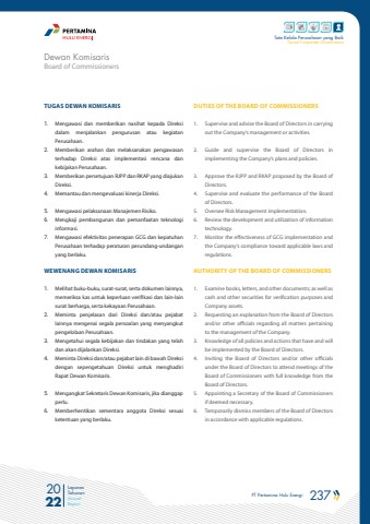 PT Pertamina Hulu Energi 237 2022Laporan TahunanAnnual ReportTata Kelola Perusahaan yang BaikGood Corporate GovernanceTUGAS DEWAN KOMISARIS1. Mengawasi dan memberikan nasihat kepada Direksi dalam menjalankan pengurusan atau kegiatan Perusahaan.2. Memberikan arahan dan melaksanakan pengawasan terhadap Direksi atas implementasi rencana dan kebijakan Perusahaan.3. Memberikan persetujuan RJPP dan RKAP yang diajukan Direksi.4. Memantau dan mengevaluasi kinerja Direksi.5. Mengawasi pelaksanaan Manajemen Risiko.6. Mengkaji pembangunan dan pemanfaatan teknologi informasi.7. Mengawasi efektivitas penerapan GCG dan kepatuhan Perusahaan terhadap peraturan perundang-undangan yang berlaku.WEWENANG DEWAN KOMISARIS 1. Melihat buku-buku, surat-surat, serta dokumen lainnya, memeriksa kas untuk keperluan verifikasi dan lain-lain surat berharga, serta kekayaan Perusahaan.2. Meminta penjelasan dari Direksi dan/atau pejabat lainnya mengenai segala persoalan yang menyangkut pengelolaan Perusahaan.3. Mengetahui segala kebijakan dan tindakan yang telah dan akan dijalankan Direksi. 4. Meminta Direksi dan/atau pejabat lain di bawah Direksi dengan sepengetahuan Direksi untuk menghadiri Rapat Dewan Komisaris. 5. Mengangkat Sekretaris Dewan Komisaris, jika dianggap perlu. 6. Memberhentikan sementara anggota Direksi sesuai ketentuan yang berlaku.DUTIES OF THE BOARD OF COMMISSIONERS1. Supervise and advise the Board of Directors in carrying out the Company%u2019s management or activities.2. Guide and supervise the Board of Directors in implementing the Company%u2019s plans and policies.3. Approve the RJPP and RKAP proposed by the Board of Directors.4. Supervise and evaluate the performance of the Board of Directors.5. Oversee Risk Management implementation.6. Review the development and utilization of information technology.7. Monitor the effectiveness of GCG implementation and the Company%u2019s compliance toward applicable laws and regulations.AUTHORITY OF THE BOARD OF COMMISSIONERS1. Examine books, letters, and other documents; as well as cash and other securities for verification purposes and Company assets.2. Requesting an explanation from the Board of Directors and/or other officials regarding all matters pertaining to the management of the Company.3. Knowledge of all policies and actions that have and will be implemented by the Board of Directors.4. Inviting the Board of Directors and/or other officials under the Board of Directors to attend meetings of the Board of Commissioners with full knowledge from the Board of Directors.5. Appointing a Secretary of the Board of Commissioners if deemed necessary.6. Temporarily dismiss members of the Board of Directors in accordance with applicable regulations.Board of CommissionersDewan Komisaris