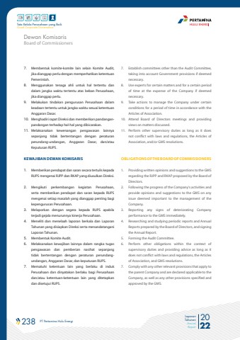 238 PT Pertamina Hulu Energi 2022Laporan TahunanAnnual ReportTata Kelola Perusahaan yang BaikGood Corporate Governance7. Membentuk komite-komite lain selain Komite Audit, jika dianggap perlu dengan memperhatikan ketentuan Pemerintah.8. Menggunakan tenaga ahli untuk hal tertentu dan dalam jangka waktu tertentu atas beban Perusahaan, jika dianggap perlu.9. Melakukan tindakan pengurusan Perusahaan dalam keadaan tertentu untuk jangka waktu sesuai ketentuan Anggaran Dasar.10. Menghadiri rapat Direksi dan memberikan pandanganpandangan terhadap hal-hal yang dibicarakan.11. Melaksanakan kewenangan pengawasan lainnya sepanjang tidak bertentangan dengan peraturan perundang-undangan, Anggaran Dasar, dan/atau Keputusan RUPS.KEWAJIBAN DEWAN KOMISARIS 1. Memberikan pendapat dan saran secara tertulis kepada RUPS mengenai RJPP dan RKAP yang diusulkan Direksi. 2. Mengikuti perkembangan kegiatan Perusahaan, serta memberikan pendapat dan saran kepada RUPS mengenai setiap masalah yang dianggap penting bagi kepengurusan Perusahaan. 3. Melaporkan dengan segera kepada RUPS apabila terjadi gejala menurunnya kinerja Perusahaan.4. Meneliti dan menelaah laporan berkala dan Laporan Tahunan yang disiapkan Direksi serta menandatangani Laporan Tahunan. 5. Membentuk Komite Audit. 6. Melaksanakan kewajiban lainnya dalam rangka tugas pengawasan dan pemberian nasihat sepanjang tidak bertentangan dengan peraturan perundangundangan, Anggaran Dasar, dan keputusan RUPS. 7. Mematuhi ketentuan lain yang berlaku di induk Perusahaan dan dinyatakan berlaku bagi Perusahaan dan/atau ketentuan-ketentuan lain yang ditetapkan dan disetujui RUPS. 7. Establish committees other than the Audit Committee, taking into account Government provisions if deemed necessary.8. Use experts for certain matters and for a certain period of time at the expense of the Company if deemed necessary.9. Take actions to manage the Company under certain conditions for a period of time in accordance with the Articles of Association.10. Attend Board of Directors meetings and providing views on matters discussed.11. Perform other supervisory duties as long as it does not conflict with laws and regulations, the Articles of Association, and/or GMS resolutions.OBLIGATIONS OF THE BOARD OF COMMISSIONERS1. Providing written opinions and suggestions to the GMS regarding the RJPP and RKAP proposed by the Board of Directors.2. Following the progress of the Company%u2019s activities and provide opinions and suggestions to the GMS on any issue deemed important to the management of the Company. 3. Reporting any signs of deteriorating Company performance to the GMS immediately.4. Researching and studying periodic reports and Annual Reports prepared by the Board of Directors, and signing the Annual Report.5. Forming the Audit Committee.6. Perform other obligations within the context of supervisory duties and providing advice as long as it does not conflict with laws and regulations, the Articles of Association, and GMS resolutions.7. Comply with any other relevant provisions that apply to the parent Company and are declared applicable to the Company, as well as any other provisions specified and approved by the GMS.Board of CommissionersDewan Komisaris