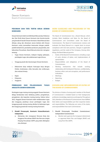 PT Pertamina Hulu Energi 239 2022Laporan TahunanAnnual ReportTata Kelola Perusahaan yang BaikGood Corporate GovernancePEDOMAN DAN TATA TERTIB KERJA DEWAN KOMISARISDewan Komisaris telah memiliki Board Manual atau Pedoman dan Tata Tertib Kerja Dewan Komisaris dan Komite-komite yang berada di bawah Dewan Komisaris. Board Manual akan ditinjau ulang dan dievaluasi secara berkala oleh Dewan Komisaris untuk memastikan kesesuaian dengan praktikpraktik terbaik GCG, perubahan peraturan yang berlaku, dan kebutuhan Perusahaan. Board Manual antara lain mengatur tentang:%u00bb Tugas Dewan Komisaris, meliputi: lingkup pekerjaan, pembagian tugas, dan pelaksanaan tugas khusus. %u00bb Tanggung jawab dan kewenangan Dewan Komisaris. %u00bb Mekanisme kerja meliputi: hubungan kerja dengan Direksi, kerahasiaan, etika berusaha dan antikorupsi, dan evaluasi kinerja. %u00bb Rapat.%u00bb Pelaporan.%u00bb Anggaran.PEMBAGIAN DAN PELAKSANAAN TUGAS ANGGOTA DEWAN KOMISARISPembagian tugas masing-masing anggota Dewan Komisaris dibagi berdasarkan latar belakang profesi, pengetahuan, pengalaman, dan kapasitas masing-masing. Selama tahun 2022, Anggota Dewan Komisaris telah melaksanakan tugas dan tanggung jawabnya sesuai pembagian tugas dan tanggung jawab masing-masing. Berikut ini beberapa tugas dan tanggung jawab dari masing-masing Komisaris:1. Rinaldi Firmansyah, Komisaris Utama/Komisaris Independena. Memantau dan mengawasi Rencana Kerja dan Anggaran Perusahaan (RKAP) dan Rencana Jangka Panjang Perusahaan (RJPP) yang telah ditetapkan atau disetujui.WORK GUIDELINES AND PROCEDURES OF THE BOARD OF COMMISSIONERSThe Board of Commissioners has a Board Manual, which includes Work Guidelines and Rules for the Board of Commissioners and Committees under the Board of Commissioners. The Board of Commissioners reviews and evaluates the Board Manual on a regular basis to ensure compliance with GCG best practices, changes in applicable regulations, and the needs of the Company. Among other things, the Board Manual governs:%u00bb Duties of the Board of Commissioners, including: scope of work, division of duties, and implementation of special duties.%u00bb Responsibilities and obligations of the Board of Commissioners.%u00bb Working mechanisms that include: working relationship with the Board of Directors, confidentiality, business ethics and anti-corruption, and performance evaluations.%u00bb Meetings.%u00bb Reporting.%u00bb Budget.DIVISION AND IMPLEMENTATION OF DUTIES OF THE BOARD OF COMMISSIONERSThe division of duties of among each member of the Board of Commissioners is divided based on their background, profession, knowledge, experience, and capacity. Throughout 2022, Members of the Board of Commissioners have fulfilled their duties and responsibilities per their respective duties and responsibilities. The following are some of the duties and responsibilities from each Commissioner: 1. Rinaldi Firmansyah, President Commissioner/Independent Commissionera. Monitor and supervise the Company%u2019s determined or approved Work Plan and Budget (RKAP) and Long-Term Plan (RJPP).Board of CommissionersDewan Komisaris