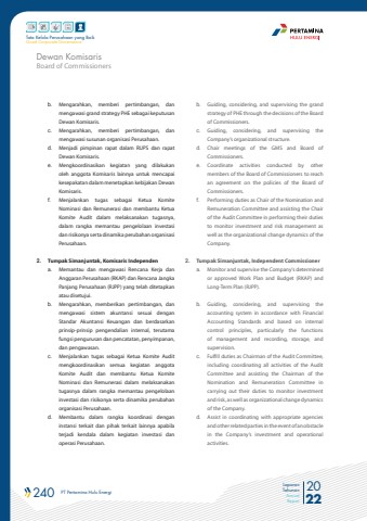 240 PT Pertamina Hulu Energi 2022Laporan TahunanAnnual ReportTata Kelola Perusahaan yang BaikGood Corporate Governanceb. Mengarahkan, memberi pertimbangan, dan mengawasi grand strategy PHE sebagai keputusan Dewan Komisaris.c. Mengarahkan, memberi pertimbangan, dan mengawasi susunan organisasi Perusahaan.d. Menjadi pimpinan rapat dalam RUPS dan rapat Dewan Komisaris.e. Mengkoordinasikan kegiatan yang dilakukan oleh anggota Komisaris lainnya untuk mencapai kesepakatan dalam menetapkan kebijakan Dewan Komisaris.f. Menjalankan tugas sebagai Ketua Komite Nominasi dan Remunerasi dan membantu Ketua Komite Audit dalam melaksanakan tugasnya, dalam rangka memantau pengelolaan investasi dan risikonya serta dinamika perubahan organisasi Perusahaan. 2. Tumpak Simanjuntak, Komisaris Independen a. Memantau dan mengawasi Rencana Kerja dan Anggaran Perusahaan (RKAP) dan Rencana Jangka Panjang Perusahaan (RJPP) yang telah ditetapkan atau disetujui. b. Mengarahkan, memberikan pertimbangan, dan mengawasi sistem akuntansi sesuai dengan Standar Akuntansi Keuangan dan berdasarkan prinsip-prinsip pengendalian internal, terutama fungsi pengurusan dan pencatatan, penyimpanan, dan pengawasan. c. Menjalankan tugas sebagai Ketua Komite Audit mengkoordinasikan semua kegiatan anggota Komite Audit dan membantu Ketua Komite Nominasi dan Remunerasi dalam melaksanakan tugasnya dalam rangka memantau pengelolaan investasi dan risikonya serta dinamika perubahan organisasi Perusahaan. d. Membantu dalam rangka koordinasi dengan instansi terkait dan pihak terkait lainnya apabila terjadi kendala dalam kegiatan investasi dan operasi Perusahaan.b. Guiding, considering, and supervising the grand strategy of PHE through the decisions of the Board of Commissioners. c. Guiding, considering, and supervising the Company%u2019s organizational structure.d. Chair meetings of the GMS and Board of Commissioners.e. Coordinate activities conducted by other members of the Board of Commissioners to reach an agreement on the policies of the Board of Commissioners. f. Performing duties as Chair of the Nomination and Remuneration Committee and assisting the Chair of the Audit Committee in performing their duties to monitor investment and risk management as well as the organizational change dynamics of the Company.2. Tumpak Simanjuntak, Independent Commissionera. Monitor and supervise the Company%u2019s determined or approved Work Plan and Budget (RKAP) and Long-Term Plan (RJPP).b. Guiding, considering, and supervising the accounting system in accordance with Financial Accounting Standards and based on internal control principles, particularly the functions of management and recording, storage, and supervision.c. Fulfill duties as Chairman of the Audit Committee, including coordinating all activities of the Audit Committee and assisting the Chairman of the Nomination and Remuneration Committee in carrying out their duties to monitor investment and risk, as well as organizational change dynamics of the Company.d. Assist in coordinating with appropriate agencies and other related parties in the event of an obstacle in the Company%u2019s investment and operational activities. Board of CommissionersDewan Komisaris