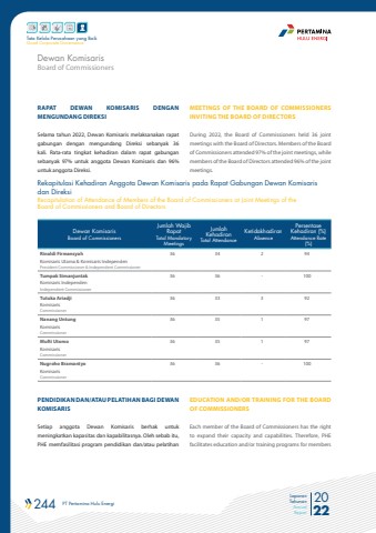 244 PT Pertamina Hulu Energi 2022Laporan TahunanAnnual ReportTata Kelola Perusahaan yang BaikGood Corporate GovernanceRAPAT DEWAN KOMISARIS DENGAN MENGUNDANG DIREKSISelama tahun 2022, Dewan Komisaris melaksanakan rapat gabungan dengan mengundang Direksi sebanyak 36 kali. Rata-rata tingkat kehadiran dalam rapat gabungan sebanyak 97% untuk anggota Dewan Komisaris dan 96% untuk anggota Direksi.Dewan KomisarisBoard of CommissionersJumlah Wajib RapatTotal Mandatory MeetingsJumlah KehadiranTotal AttendanceKetidakhadiranAbsencePersentase Kehadiran (%)Attendance Rate (%)Rinaldi FirmansyahKomisaris Utama & Komisaris IndependenPresident Commissioner & Independent Commissioner36 34 2 94Tumpak SimanjuntakKomisaris IndependenIndependent Commissioner36 36 - 100Tutuka AriadjiKomisaris Commissioner36 33 3 92Nanang UntungKomisaris Commissioner36 35 1 97Mufti UtomoKomisaris Commissioner36 35 1 97Nugroho BramantyoKomisaris Commissioner36 36 - 100Rekapitulasi Kehadiran Anggota Dewan Komisaris pada Rapat Gabungan Dewan Komisaris dan Direksi Recapitulation of Attendance of Members of the Board of Commissioners at Joint Meetings of the Board of Commissioners and Board of DirectorsPENDIDIKAN DAN/ATAU PELATIHAN BAGI DEWAN KOMISARISSetiap anggota Dewan Komisaris berhak untuk meningkatkan kapasitas dan kapabilitasnya. Oleh sebab itu, PHE memfasilitasi program pendidikan dan/atau pelatihan MEETINGS OF THE BOARD OF COMMISSIONERS INVITING THE BOARD OF DIRECTORSDuring 2022, the Board of Commissioners held 36 joint meetings with the Board of Directors. Members of the Board of Commissioners attended 97% of the joint meetings, while members of the Board of Directors attended 96% of the joint meetings.EDUCATION AND/OR TRAINING FOR THE BOARD OF COMMISSIONERSEach member of the Board of Commissioners has the right to expand their capacity and capabilities. Therefore, PHE facilitates education and/or training programs for members Board of CommissionersDewan Komisaris
