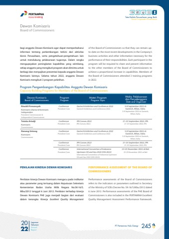 PT Pertamina Hulu Energi 245 2022Laporan TahunanAnnual ReportTata Kelola Perusahaan yang BaikGood Corporate Governancebagi anggota Dewan Komisaris agar dapat memperbaharui informasi tentang perkembangan terkini dari aktivitas bisnis Perusahaan, serta pengetahuan-pengetahuan lain untuk mendukung pelaksanaan tugasnya. Dalam rangka mengupayakan peningkatan kapabilitas yang seimbang, setiap anggota yang mengikuti program akan diminta untuk berbagi dan menyajikan presentasi kepada anggota Dewan Komisaris lainnya. Selama tahun 2022, anggota Dewan Komisaris mengikuti 3 program pelatihan.Dewan KomisarisBoard of CommissionersProgramProgramMateri ProgramProgram TopicWaktu Pelaksanaan dan PenyelenggaraDate and OrganizerRinaldi FirmansyahKomisaris Utama & Komisaris IndependenPresident Commissioner & Independent CommissionerConferencePresident ComGastech Exhibition and Conference 2022Gastech Exhibition and Conference 20225-8 September 2022 di Gastech, Milan, Italia.5-8 September 2022 at Gastech, Milan, Italia.Tutuka AriadjiKomisaris CommissionerConferencePresident ComIPA Convex 2022IPA Convex 202221-23 September 2022, IPA21-23 September 2022, IPANanang UntungKomisaris CommissionerConferencePresident ComGastech Exhibition and Conference 2022Gastech Exhibition and Conference 20225-8 September 2022 di Gastech, Milan, Italia.5-8 September 2022 at Gastech, Milan, Italia.ConferencePresident ComIPA Convex 2022IPA Convex 202221-23 September 2022, IPA21-23 September 2022, IPAConferencePresident ComInternational Convention of Indonesia Upstream Oil and Gas 2022 (IOG 2022)International Convention of Indonesia Upstream Oil and Gas 2022 (IOG 2022)23-25 November 2022 di Bali23-25 November 2022 at BaliProgram Pengembangan Kapabilitas Anggota Dewan KomisarisCapacity Building Programs for Members of the Board of CommissionersPENILAIAN KINERJA DEWAN KOMISARISPenilaian kinerja Dewan Komisaris mengacu pada indikator atau parameter yang tertuang dalam Keputusan Sekretaris Kementerian Badan Usaha Milik Negara No.SK-16/S.Mbu/2012 tanggal 6 Juni 2012. Penilaian terhadap kinerja Dewan Komisaris PHE juga menjadi bagian dari evaluasi dalam kerangka Kinerja Excellent Quality Management of the Board of Commissioners so that they can remain upto-date on the most recent developments in the Company%u2019s business activities and other information necessary for the performance of their responsibilities. Each participant in the program will be required to share and present information to the other members of the Board of Commissioners to achieve a proportional increase in capabilities. Members of the Board of Commissioners attended 3 training programs in 2022.PERFORMANCE ASSESSMENT OF THE BOARD OF COMMISSIONERSPerformance assessments of the Board of Commissioners refers to the indicators or parameters outlined in Secretary of the Ministry of SOEs Decree No. SK-16/S.Mbu/2012 dated 6 June 2012. Performance assessments of the PHE Board of Commissioners is also included in the PERTAMINA Excellent Quality Management Assessment Performance framework. Board of CommissionersDewan Komisaris
