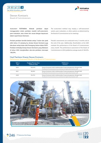 246 PT Pertamina Hulu Energi 2022Laporan TahunanAnnual ReportTata Kelola Perusahaan yang BaikGood Corporate GovernanceAssessment PERTAMINA. Metode penilaian dapat menggunakan sistem penilaian mandiri (self-assessment), peer evaluation, atau sistem lain sesuai dengan keputusan dalam rapat Dewan Komisaris.Periode penilaian bersifat berkala setiap 3 bulan dan pada akhir tahun. Di samping itu, kinerja Dewan Komisaris juga dievaluasi setiap bulan oleh Pemegang Saham dalam RUPS. Penilaian terhadap kinerja Dewan Komisaris yang dilakukan di tahun 2022 menghasilkan rata-rata penilaian mencapai 108,59%.The assessment method may employ a self-assessment system, peer evaluation, or other systems as determined by the Board of Commissioners at its meetings.Periodic assessments are conducted every 3 months and at the end of the year. Additionally, Shareholders at the GMS evaluate the performance of the Board of Commissioners every month. The performance assessment of the Board of Commissioners in 2022 yielded an average result of 108.59%.TahunYearTingkat PemenuhanFulfillment RatePelaksanaAssessor2022 108,59% Dewan Komisaris telah melaksanakan fungsi pengawasan dengan baik.The Board of Commissioners has carried out its supervisory function well.2021 98,50% Dewan Komisaris telah melaksanakan fungsi pengawasan dengan baik.The Board of Commissioners has carried out its supervisory function well.2020 92,27% Dewan Komisaris telah melaksanakan fungsi pengawasan dengan baik.The Board of Commissioners has carried out its supervisory function well.Hasil Penilaian Kinerja Dewan KomisarisPerformance Assessment Results of the Board of CommissionersBoard of CommissionersDewan Komisaris