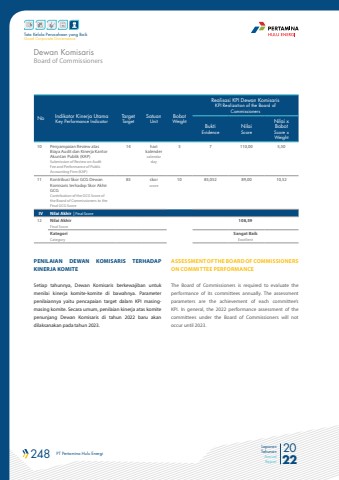 248 PT Pertamina Hulu Energi 2022Laporan TahunanAnnual ReportTata Kelola Perusahaan yang BaikGood Corporate GovernanceNo Indikator Kinerja UtamaKey Performance IndicatorTargetTargetSatuanUnitBobotWeightRealisasi KPI Dewan KomisarisKPI Realization of the Board ofCommissionersBuktiEvidenceNilaiScoreNilai x BobotScore x Weight10 Penyampaian Review atas Biaya Audit dan Kinerja Kantor Akuntan Publik (KAP)Submission of Review on Audit Fee and Performance of Public Accounting Firm (KAP)14 hari kalendercalendar day5 7 110,00 5,5011 Kontribusi Skor GCG Dewan Komisaris terhadap Skor Akhir GCGContribution of the GCG Score of the Board of Commissioners to the Final GCG Score85 skorscore10 85,052 89,00 10,52IV Nilai Akhir | Final Score12 Nilai Akhir Final Score108,59Kategori CategorySangat Baik ExcellentPENILAIAN DEWAN KOMISARIS TERHADAP KINERJA KOMITESetiap tahunnya, Dewan Komisaris berkewajiban untuk menilai kinerja komite-komite di bawahnya. Parameter penilaiannya yaitu pencapaian target dalam KPI masingmasing komite. Secara umum, penilaian kinerja atas komite penunjang Dewan Komisaris di tahun 2022 baru akan dilaksanakan pada tahun 2023. ASSESSMENT OF THE BOARD OF COMMISSIONERS ON COMMITTEE PERFORMANCEThe Board of Commissioners is required to evaluate the performance of its committees annually. The assessment parameters are the achievement of each committee%u2019s KPI. In general, the 2022 performance assessment of the committees under the Board of Commissioners will not occur until 2023.Board of CommissionersDewan Komisaris