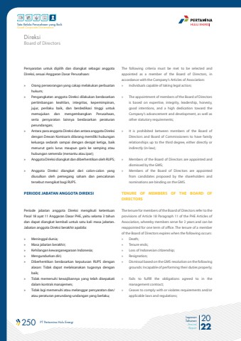 250 PT Pertamina Hulu Energi 2022Laporan TahunanAnnual ReportTata Kelola Perusahaan yang BaikGood Corporate GovernancePersyaratan untuk dipilih dan diangkat sebagai anggota Direksi, sesuai Anggaran Dasar Perusahaan: %u00bb Orang perseorangan yang cakap melakukan perbuatan hukum; %u00bb Pengangkatan anggota Direksi dilakukan berdasarkan pertimbangan keahlian, integritas, kepemimpinan, jujur, perilaku baik, dan berdedikasi tinggi untuk memajukan dan mengembangkan Perusahaan, serta persyaratan lainnya berdasarkan peraturan perundangan; %u00bb Antara para anggota Direksi dan antara anggota Direksi dengan Dewan Komisaris dilarang memiliki hubungan keluarga sedarah sampai dengan derajat ketiga, baik menurut garis lurus maupun garis ke samping atau hubungan semenda (menantu atau ipar); %u00bb Anggota Direksi diangkat dan diberhentikan oleh RUPS;%u00bb Anggota Direksi diangkat dari calon-calon yang diusulkan oleh pemegang saham dan pencalonan tersebut mengikat bagi RUPS. PERIODE JABATAN ANGGOTA DIREKSIPeriode jabatan anggota Direksi mengikuti ketentuan Pasal 18 ayat 11 Anggaran Dasar PHE, yaitu selama 3 tahun dan dapat diangkat kembali untuk satu kali masa jabatan. Jabatan anggota Direksi berakhir apabila: %u00bb Meninggal dunia;%u00bb Masa jabatan berakhir; %u00bb Kehilangan kewarganegaraan Indonesia; %u00bb Mengundurkan diri;%u00bb Diberhentikan berdasarkan keputusan RUPS dengan alasan: Tidak dapat melaksanakan tugasnya dengan baik; %u00bb Tidak memenuhi kewajibannya yang telah disepakati dalam kontrak manajemen; %u00bb Tidak lagi memenuhi atau melanggar persyaratan dan/atau peraturan perundang-undangan yang berlaku; The following criteria must be met to be selected and appointed as a member of the Board of Directors, in accordance with the Company%u2019s Articles of Association:%u00bb Individuals capable of taking legal action;%u00bb The appointment of members of the Board of Directors is based on expertise, integrity, leadership, honesty, good intentions, and a high dedication toward the Company%u2019s advancement and development, as well as other statutory requirements;%u00bb It is prohibited between members of the Board of Directors and Board of Commissioners to have family relationships up to the third degree, either directly or indirectly (in-law);%u00bb Members of the Board of Directors are appointed and dismissed by the GMS;%u00bb Members of the Board of Directors are appointed from candidates proposed by the shareholders and nominations are binding on the GMS.TENURE OF MEMBERS OF THE BOARD OF DIRECTORSThe tenure for members of the Board of Directors refer to the provisions of Article 18 Paragraph 11 of the PHE Articles of Association, whereby members serve for 3 years and can be reappointed for one term of office. The tenure of a member of the Board of Directors expires when the following occurs:%u00bb Death;%u00bb Tenure ends;%u00bb Loss of Indonesian citizenship;%u00bb Resignation;%u00bb Dismissal based on the GMS resolution on the following grounds: Incapable of performing their duties properly;%u00bb Fails to fulfill the obligations agreed to in the management contract;%u00bb Ceases to comply with or violates requirements and/or applicable laws and regulations;Board of DirectorsDireksi