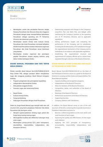252 PT Pertamina Hulu Energi 2022Laporan TahunanAnnual ReportTata Kelola Perusahaan yang BaikGood Corporate Governance%u00bb Menetapkan usulan dan perubahan Rencana Jangka Panjang Perusahaan dan Rencana Kerja dan Anggaran Perusahaan dengan tetap memperhatikan kedudukan Perusahaan sebagai operating arm PT Pertamina (Persero) dan ketentuan yang berlaku. %u00bb Menetapkan sasaran kinerja serta evaluasi kinerja Perusahaan dan Anak Perusahaan, termasuk kebijakan dividen Anak Perusahaan melalui mekanisme organisasi Perusahaan dan Anak Perusahaan sesuai ketentuan yang berlaku. %u00bb Menetapkan struktur organisasi dan penetapan pejabat Perusahaan sampai jenjang tertentu yang diatur melalui ketetapan Direksi.BOARD MANUAL (PEDOMAN DAN TATA TERTIB KERJA DIREKSI) Direksi memiliki Board Manual No.A-005/PHE040/2018-S9 Kerja Direksi PHE, sebagai panduan dalam menjalankan tugas dan tanggung jawabnya. Board Manual mengatur tentang:%u00bb Program pengenalan dan peningkatan kapabilitas;%u00bb Independensi (kemandirian) Direksi;%u00bb Etika jabatan anggota Direksi;%u00bb Susunan, tugas, dan wewenang Direksi;%u00bb Rapat Direksi;%u00bb Evaluasi kinerja Direksi;%u00bb Fungsi pendukung;%u00bb Hubungan Perusahaan dengan Anak Perusahaan. Selain itu, fungsi Board Manual juga menjadi salah satu soft structure GCG yang berisi penjabaran Pedoman Tata Kelola Perusahaan dan bertujuan untuk: %u00bb Menjadi rujukan/pedoman tentang tugas pokok dan fungsi kerja masing-masing organ; %u00bb Meningkatkan kualitas dan efektivitas hubungan kerja antar-organ;%u00bb Menerapkan prinsip-prinsip GCG, yakni transparansi, akuntabilitas, responsibilitas, independensi, dan kewajaran (fairness). %u00bb Determining proposals and changes to the Company%u2019s Long-Term Plan and Work Plan and Budget while maintaining the Company%u2019s position as the operating arm of PT Pertamina (Persero) and its applicable regulations.%u00bb Setting performance targets and evaluating the performance of the Company and its subsidiaries, including the dividend policy of its Subsidiaries through the organizational mechanism of the Company and its Subsidiaries in accordance with applicable regulations.%u00bb Establishing the organizational structure and appointment of Company officials up to a certain level, regulated through a decision of the Board of Directors.BOARD MANUAL (WORK GUIDELINES AND RULES OF THE BOARD OF DIRECTORS)Board Manual No.A-005/PHE040/2018-S9 on the Work of the PHE Board of Directors serves as a guide for the Board of Directors in carrying out their duties and responsibilities. The Board Manual regulates:%u00bb Capacity building and recognition programs;%u00bb Independence of the Board of Directors;%u00bb Ethics for members of the Board of Directors;%u00bb Composition, duties, and authorities of the Board of Directors;%u00bb Meetings of the Board of Directors;%u00bb Performance assessment of the Board of Directors;%u00bb Supporting function;%u00bb Company relations with Subsidiaries.In addition, the Board Manual serves as one of the soft structures of the GCG, containing the Corporate Governance Guidelines%u2019 elaboration and aims to:%u00bb Become a reference/guideline on the main duties and work functions of each organ;%u00bb Improving the quality and effectiveness of inter-organ work relations;%u00bb Applying the GCG principles of transparency, accountability, responsibility, independence, and fairness.Board of DirectorsDireksi